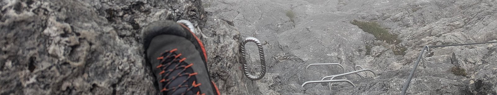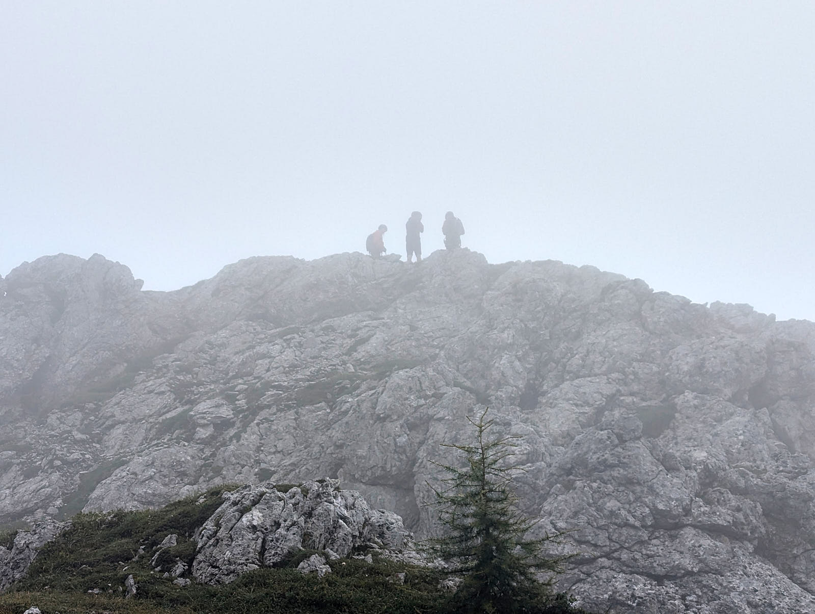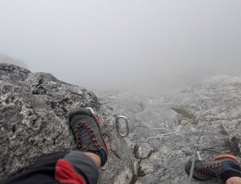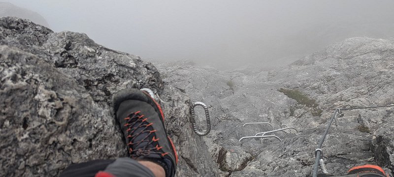 Am Fuß des Turms angelangt muss man links herum absteigen in eine Schlucht. Das ist eine ziemlich steile und saftig ausgesetzte Angelegenheit. Der Nebel…