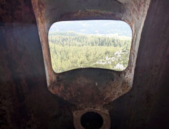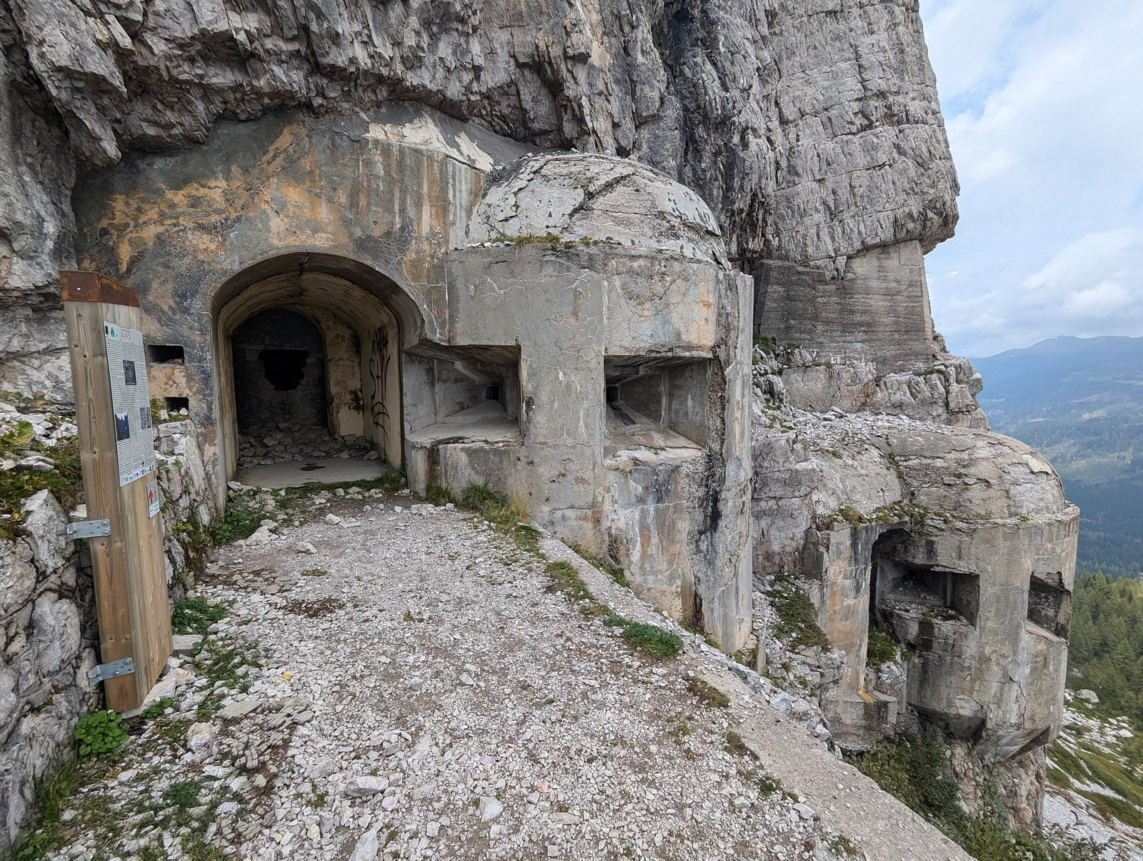Beim rustikalen Abstieg von der Forcella Popera kommen die ersten Bunkeranlagen in Sichtweite. Bei dem markanten, eckigen Bauwerk ist der Eingang.