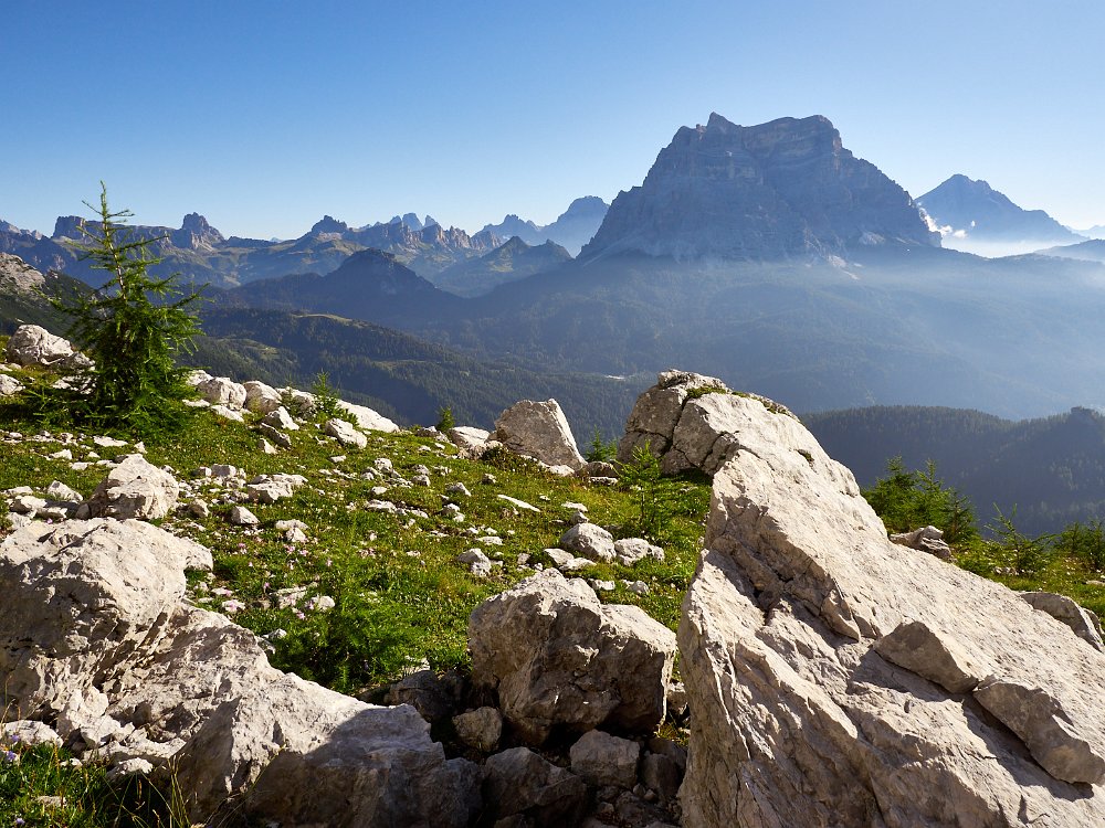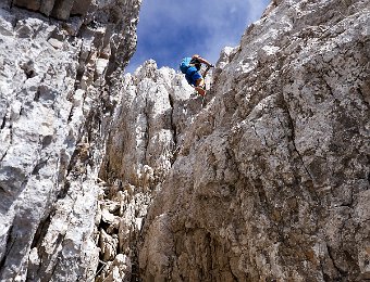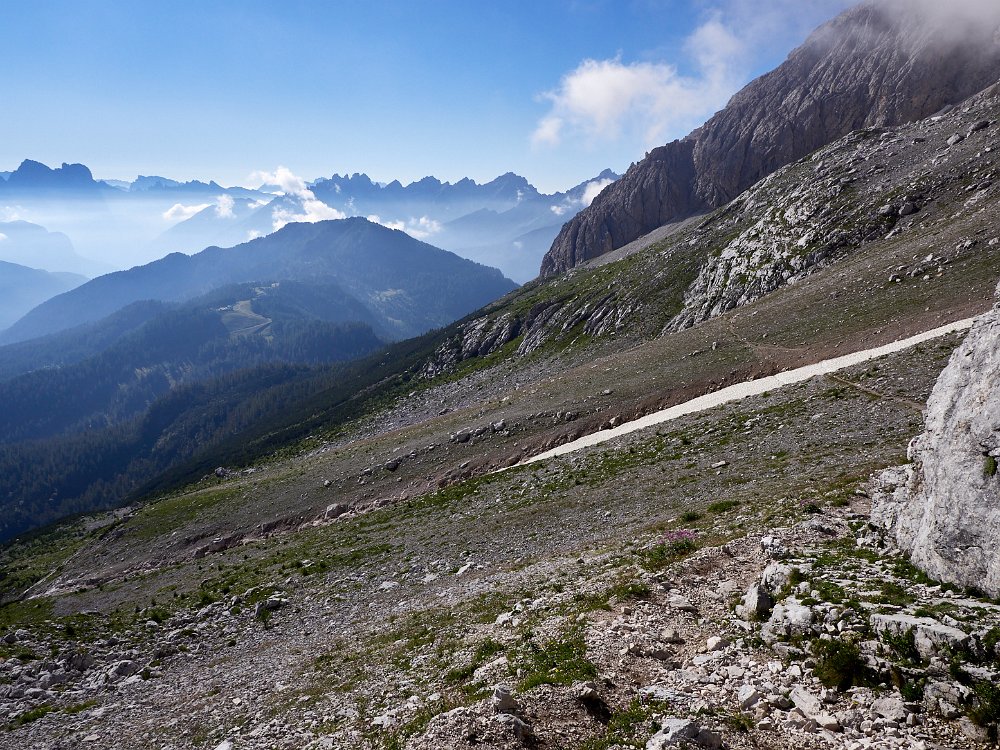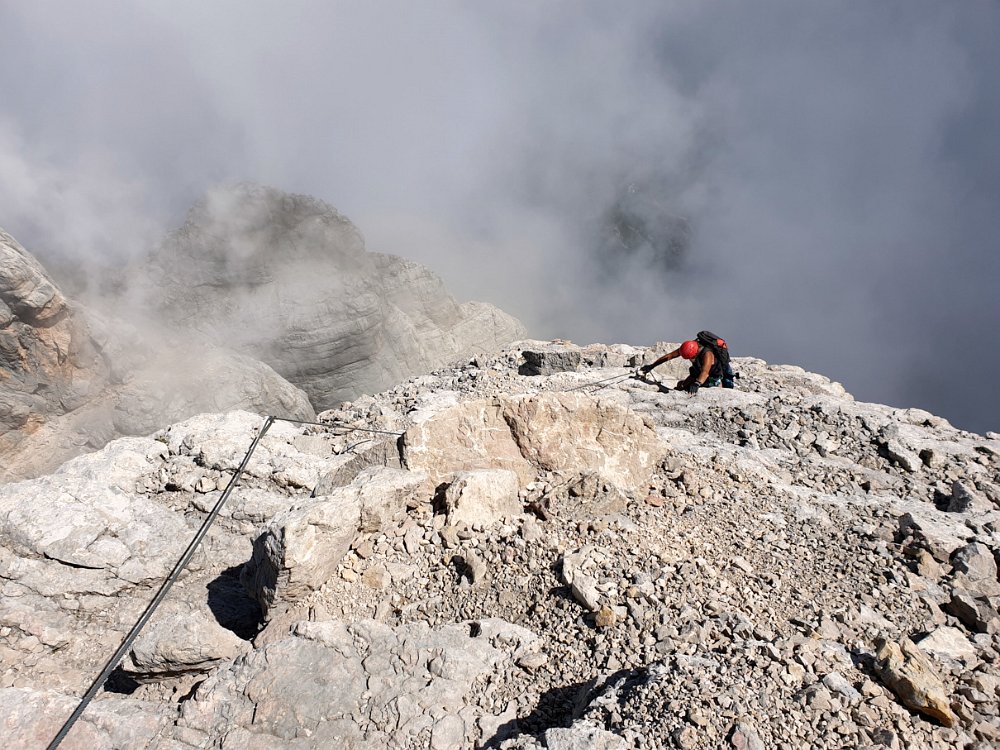 Der Wetterbericht versprach einen schönen Tag in einer sehr unbeständigen Wetterphase. Also ging ich schon am ersten Tag meines Urlaubs gleich die fetteste geplante Tour. Nicht akklimatisiert war das keine gute Idee. Im letzten Drittel bekam ich leichtes Kopfweh. Ich musste die Anstrengung gut dosieren und öfter Pause machen, weil ich sonst in ein Eck gekotzt hätte. Noch nie habe ich so mit mir selber kämpfen müssen. Da waren so einige Aspiranten unterwegs, die auch schwer zu beißen hatten. Der Klettersteig ist eigentlich eine großartige, aber auch sehr lange Unternehmung. Das Ding will und will nicht enden.