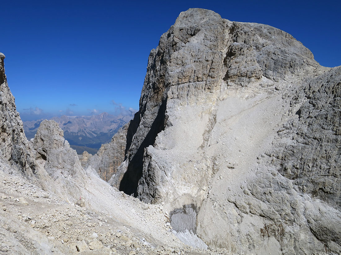 Die Cima Vezzana war eigentlich mein Ziel, aber über 1h Verspätung wegen einer Straßensperrung und eine offene Blase am Fuß vereitelten diesen Plan. Die letzte Bahn ging um 16:30 und man kann den Abstieg nicht durch schneller gehen beschleunigen, wie sich bald zeigen wird. | ![]() |