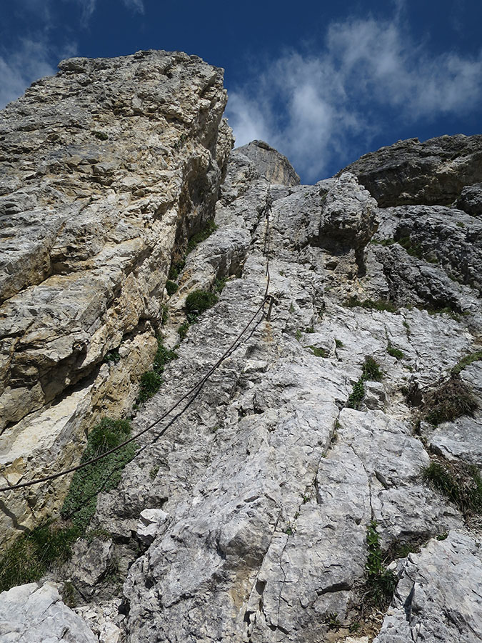 Ganz zum Schluss kommt noch eine überraschende Stufe im Klettersteig-Grad D. Wenigstens das Drahtseil ist ok. Sonst wär's kaum machbar. Anschließend trifft man auf den Weg von der Rosetta Hütte und die Seilbahn vom Col Verde ist nicht mehr weit. | ![]() |
