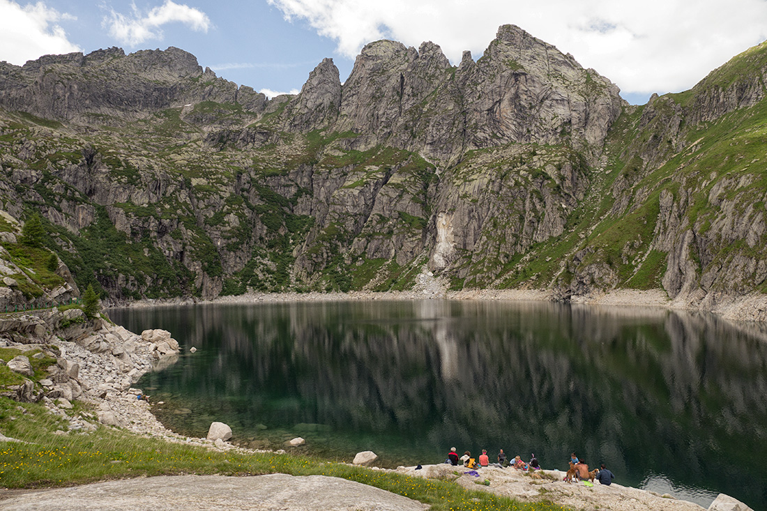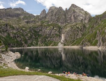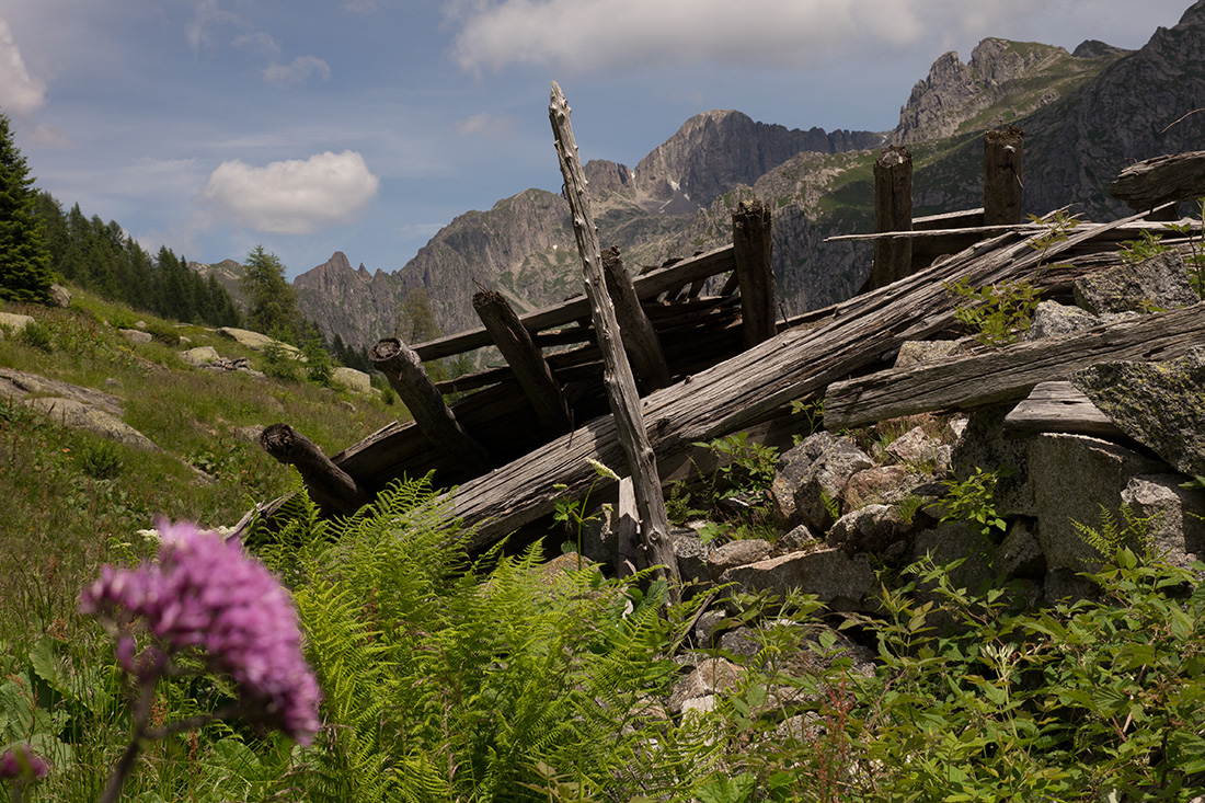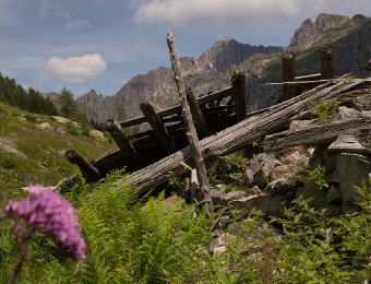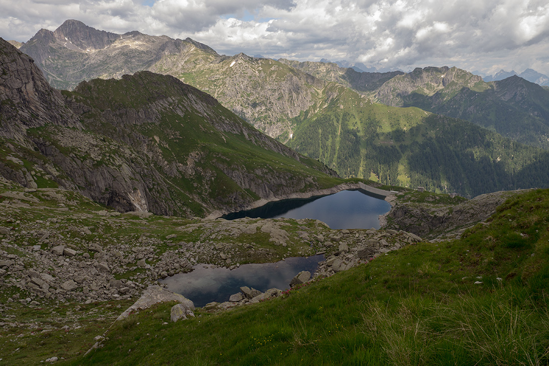 Im Lagorai war ich dieses Jahr zum ersten Mal. Die Gruppe um die Cima d'Asta herum ist ein Granitgebirge. Eine ganz andere Landschaft als sonst in den Dolomiten. Viel grüner, kleine Seen, und das Wasser läuft überall herunter. Weil meine f** Landkarte Pfade eingezeichnet hatte, die es bestimmt seit 20J nicht mehr gibt, wurde die Runde etwas komplizierter und mit 11h empfindlich länger als geplant.