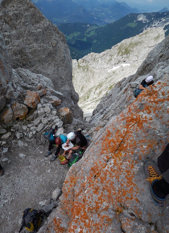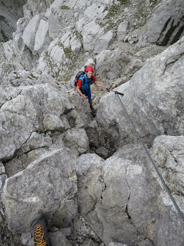 Die Elmauer Halt ist der höchste Gipfel des Wilden Kaisers. Die Tour von der Wochenbrunner Alm aus über den Gamsängersteig ist mit Recht sehr beliebt. Sie ist sehr abwechslungsreich und nicht allzu lang mit 1250Hm. Die unverschämt schön gelegene Gruttenhütte lädt beim Auf- und Abstieg zum Verweilen ein. Eine Idealtour. Der Klettersteig ist gnädig aber nicht langweilig, ganz im Gegenteil. Ein Helm sollte auf den Kopf! Selbstsicherung ist Ermessenssache, abhängig von der eigenen Routine in so einem Gelände.