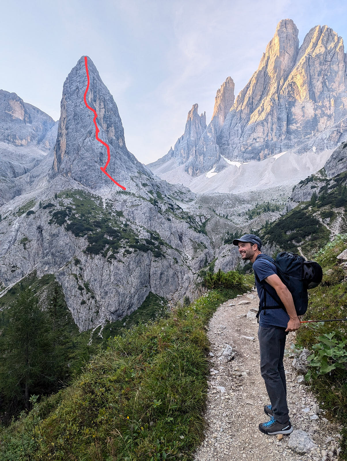 Die Nordkante der Hochleist ist eine Insidertour, für die es im Netz keine Informationen gibt. Der Sextner Bergführer Hannes Egarter kannte natürlich die Route in seinem Wohnzimmer. Die Absicherung ist spärlich. Abgesehen von den insgesamt anständig eingerichteten Ständen gibt's nur an den steilsten Fünfer-Passagen Bohr- und Normalhaken. Sonst gibt's praktisch nichts. Manche Passagen sind auch nicht ganz einfach abzusichern, weil der Fels ziemlich kompakt ist.
