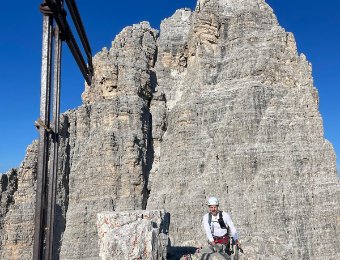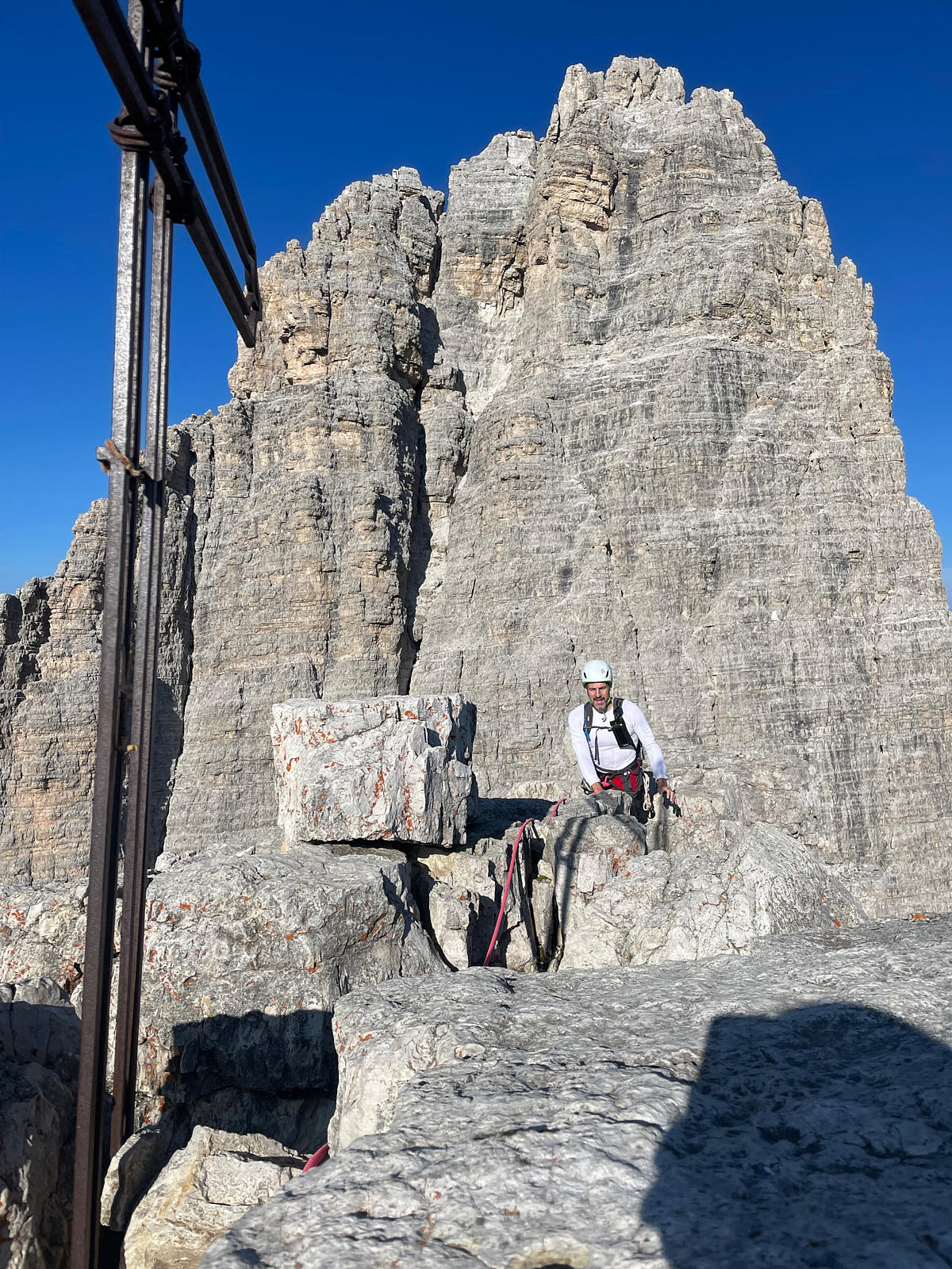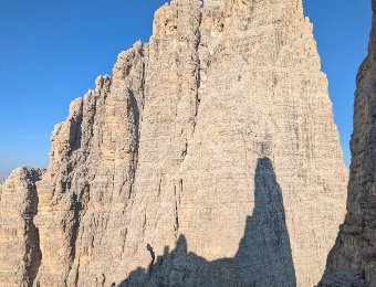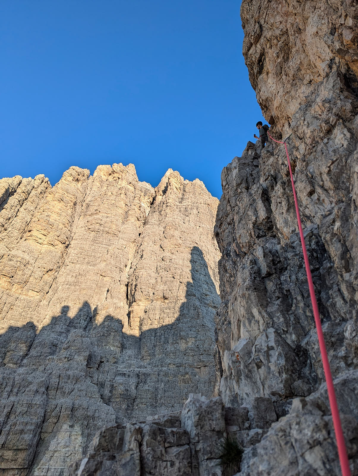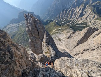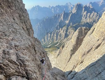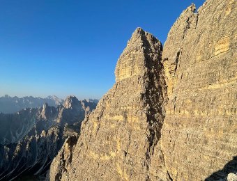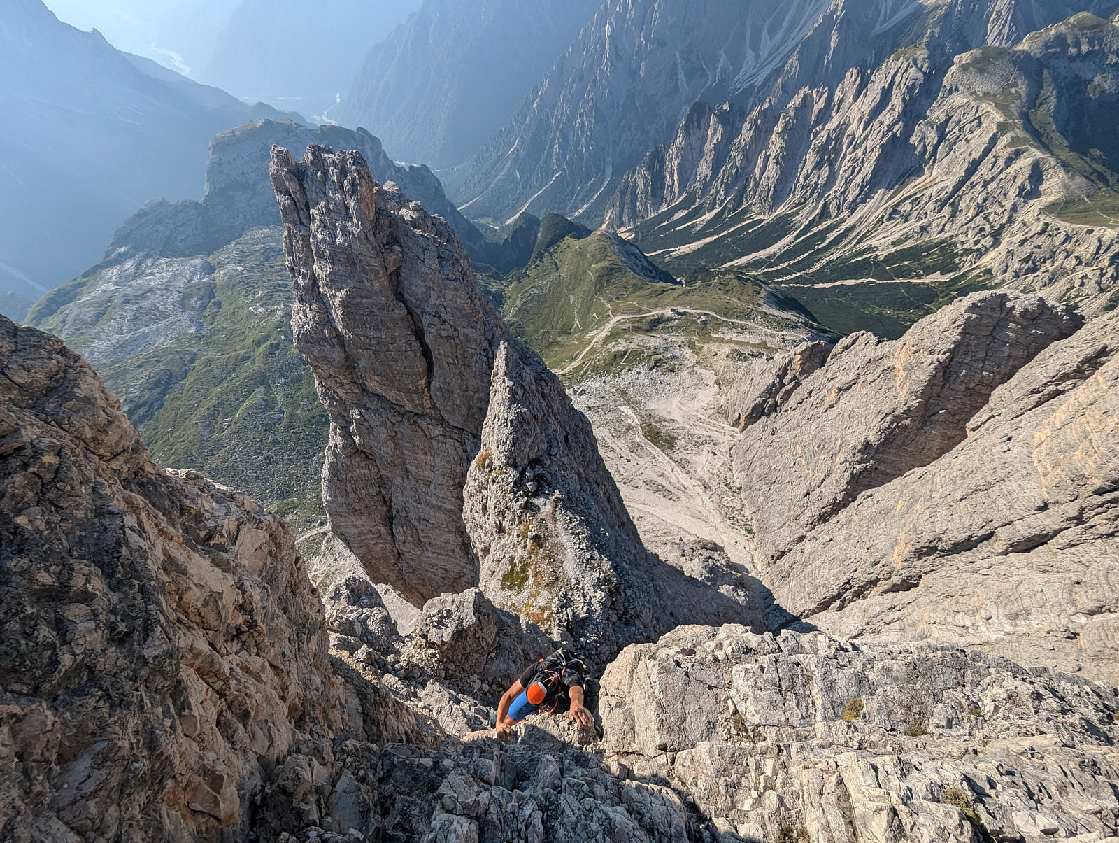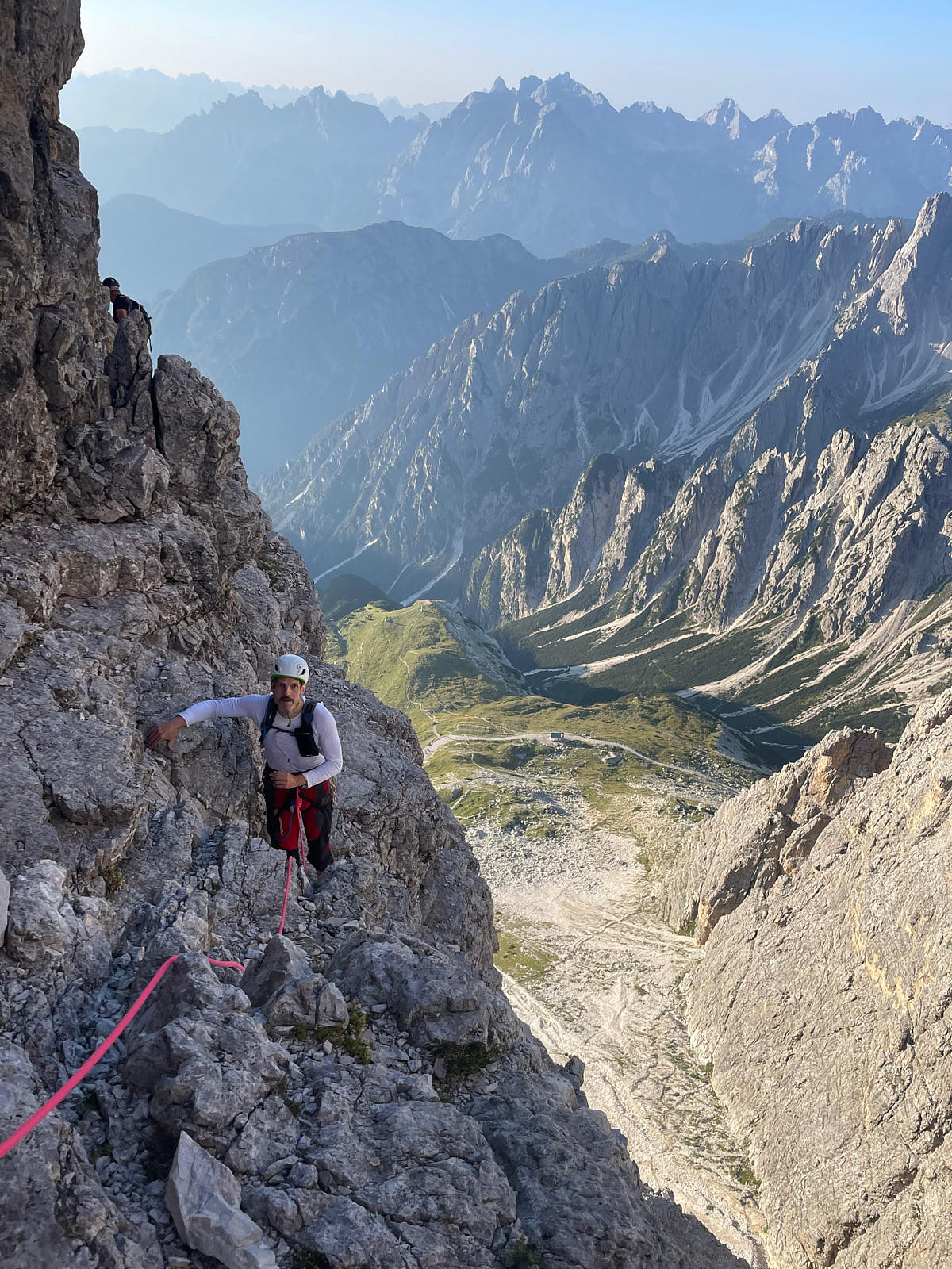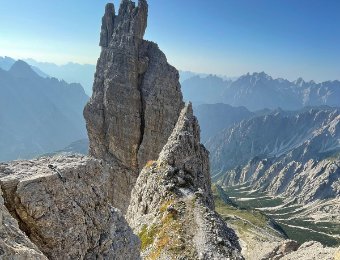 Die zweite Tour mit Hannes sollte ein Klassiker werden. Was gibt's da besseres als eine der Drei Zinnen? Die Kleine Zinne hat den technisch schwierigsten Normalweg und ist weniger überlaufen. Die Route windet sich sehr beeindruckend in einem großartigen Ambiente hinauf auf den Turm. Wenn man einen wieselflinken Vorsteiger hat, der jeden Tritt und Griff auswendig kennt, wird die Kletterei zum Genuss.