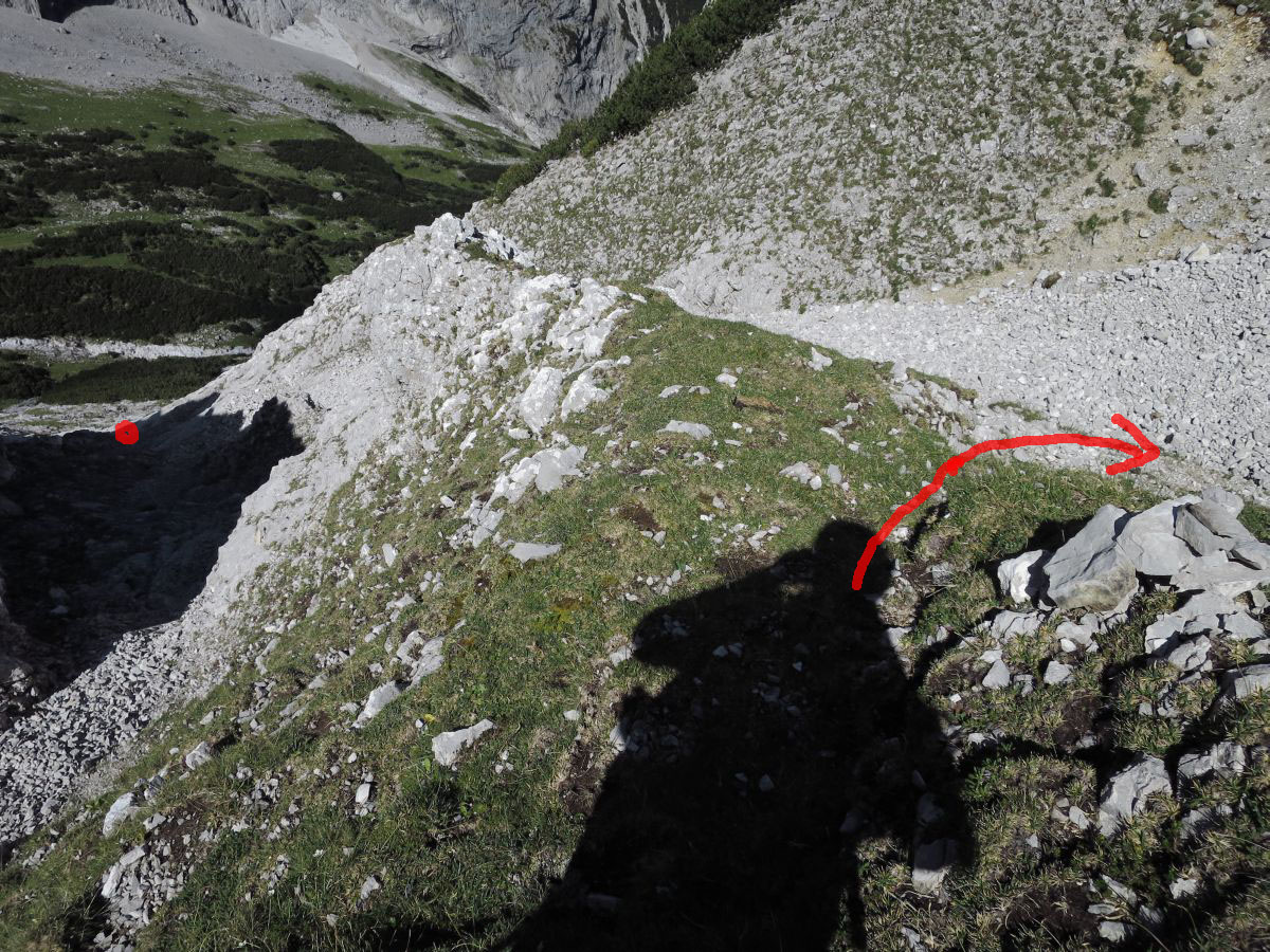 Die Rinnen in Abstiegsrichtung. Nicht den kürzesten Weg nehmen. Erst rechts runter und dann wieder nach links zur Stufe (Punkt)