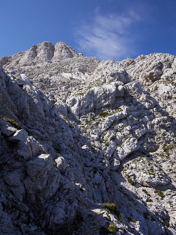 Ab hier enden die Drahtseile und Schrofenkraxelei führt an den Gipfel heran, der oben schon zu sehen ist.