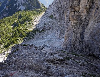 Von der markanten Fichte auf dem Grat geht es erst eine Rinne hoch und dann folgen schöne Querungen auf luftigen, aber breiten Bändern.