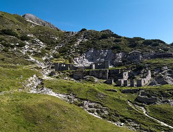 Von der Malga Somndogna hinauf zu den Überresten des Ricovero Battaglione Alpini Gemona. Im Hintergrund der Gipfel des Jof di Miezegnot.
