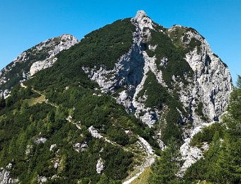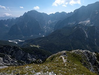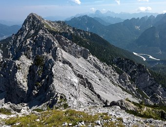 Auf dem unscheinbaren Gipfel gibt's eine schöne Sicht auf das Valle Saisera. Gegenüber dominiert der Jof Fuart mit seinem kleinen Nachbar Monte Nabois davor.