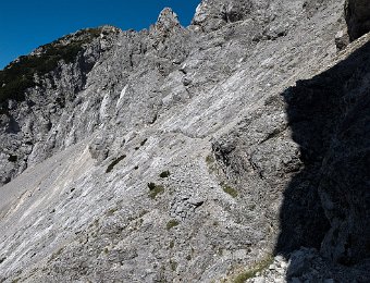 Der Jof die Miezegnot hinter dem wilden Schotterquergang, der an der markanten Felsnase in Bildmitte beginnt.