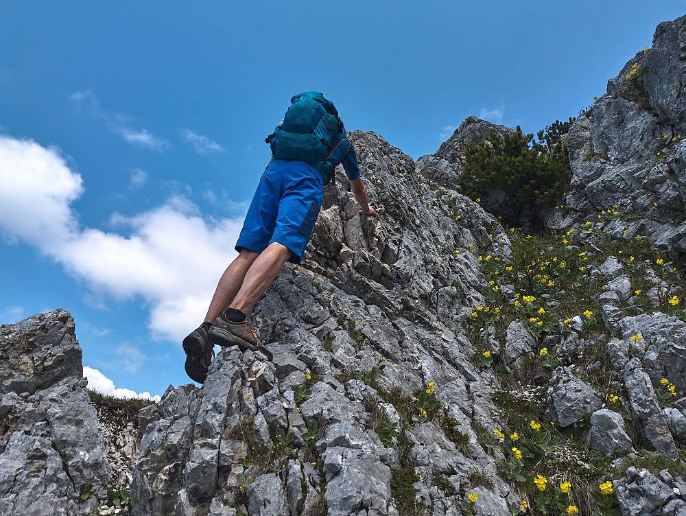 Wir sind begeistert von dem überwiegend festen Fels und den hübschen Blumen, die hier aus allen Ritzen sprießen. Der Helm hätte nicht unbedingt mit müssen. Die…