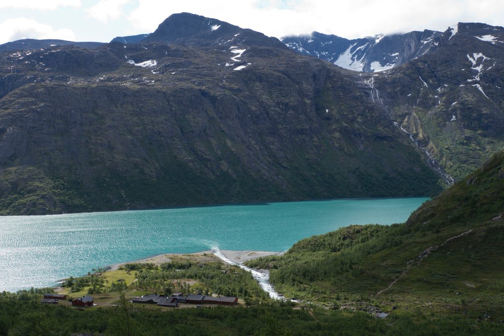 Auf dem Weg zum Besseggengrat. Die Siedlung Memurubu wird per Boot angesteuert und die Tour führt über den Bergkamm wieder zum Ausgangspunkt zurück.