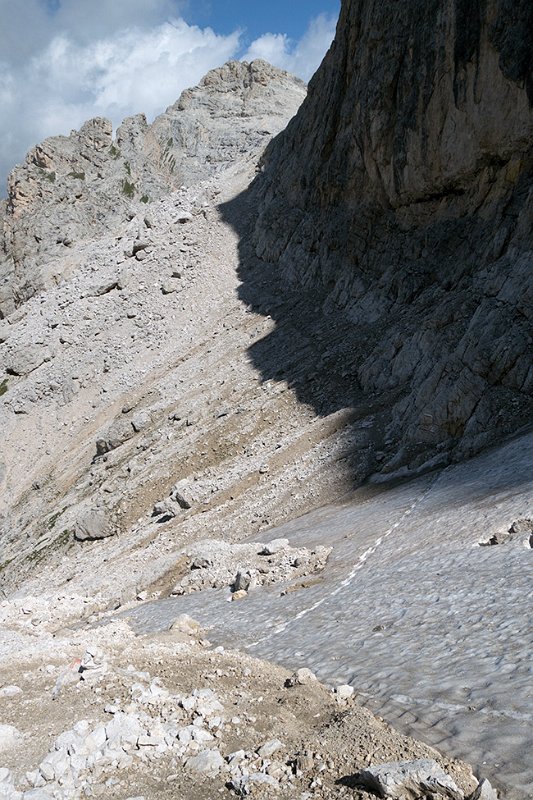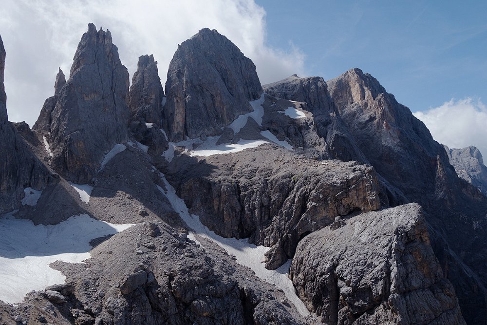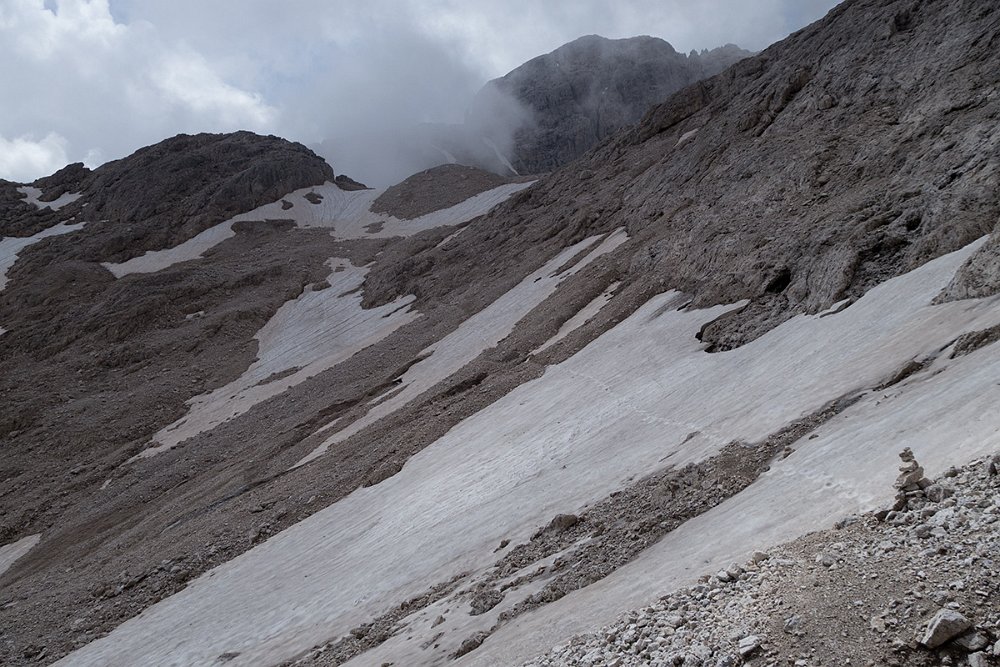 Die Cima dei Bureloni ist fast so hoch wie ihre Nachbarin, die Cima della Vezzana. Dieser undankbare dritte Platz reicht aus, dass sie kaum besucht wird. So gibt es hier auch keine Markierungen mehr ab dem Passo delle Farangole. Nur Wegspuren und Steinmänner. Eine total einsame und wilde Gegend. Ich bin über drei Stunden lang niemand begegnet. Die Tour ist extrem lang vom Rollepass aus. 2000Hm mit allem Auf und Ab und über 10 Stunden mit Pausen.