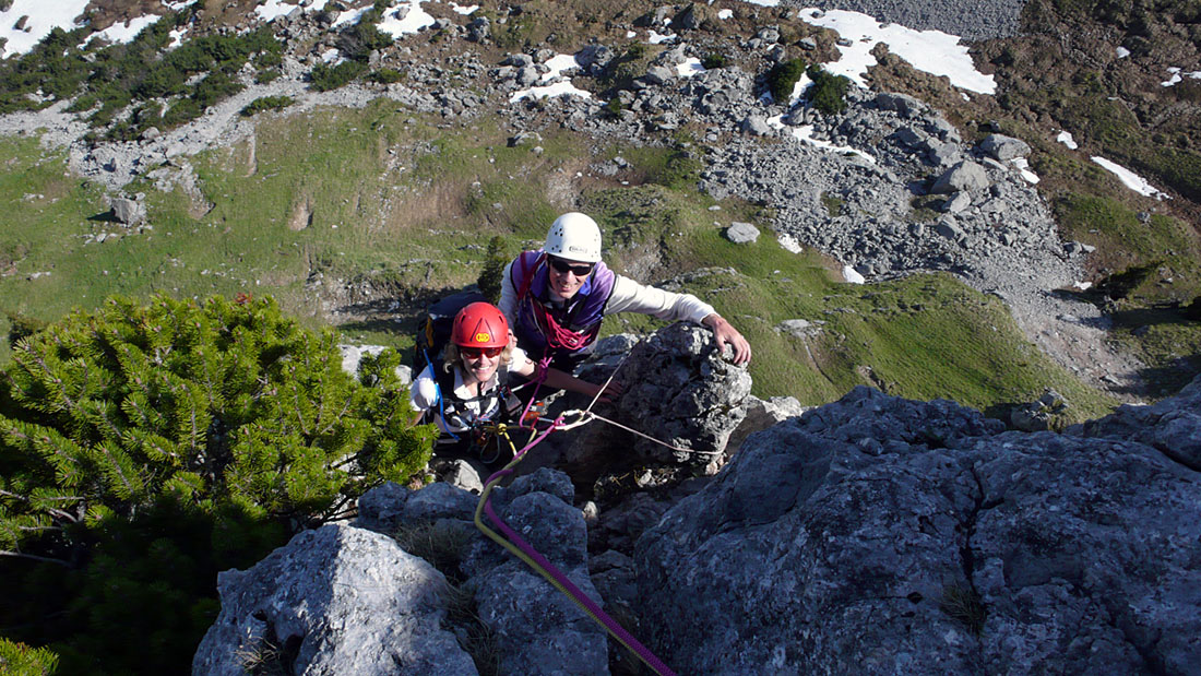 | planken 070 | Letzter Stand kurz vor dem Gipfel. Es geht nach einer grasigen Rinne sauber luftig ums Eck, bevor man zu den Latschen "einbiegt". Fette Köpferl bieten eine willkommene Sicherungsmöglichkeit. | |