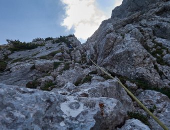 Ein perfekter, warmer Sommertag für eine Nordwand. Die Ostlerroute ist ein Klassiker im dritten Grad. Dezent saniert mit perfekten Standplätzen und an den wichtigsten Stellen sind Klebehaken genau wo man sie braucht. Im Zweiergelände steckt nie was, hier wird angenommen, dass man entweder ohne Zwischensicherung geht oder selber was legt. Mit Camalots lila, grün und rot konnten wir immer wieder gut arbeiten. Die Schlüsselstelle am Schluss ist mit 4 hart bewertet. Ohne A0 hätte ich da wenig Chancen gehabt. Mag auch daran liegen, dass ich 100kg mit Material wiege und Überhänge hasse. Ansonsten steht man da bequem und kann nirgendwo runterfallen. Das Kriechband der "Nassen Nische" ist unangenehm eng mit Rucksack. Das war eigentlich die härteste Stelle, weil mit Absturzgefahr in eine Rinne.