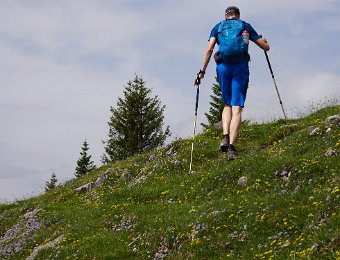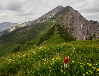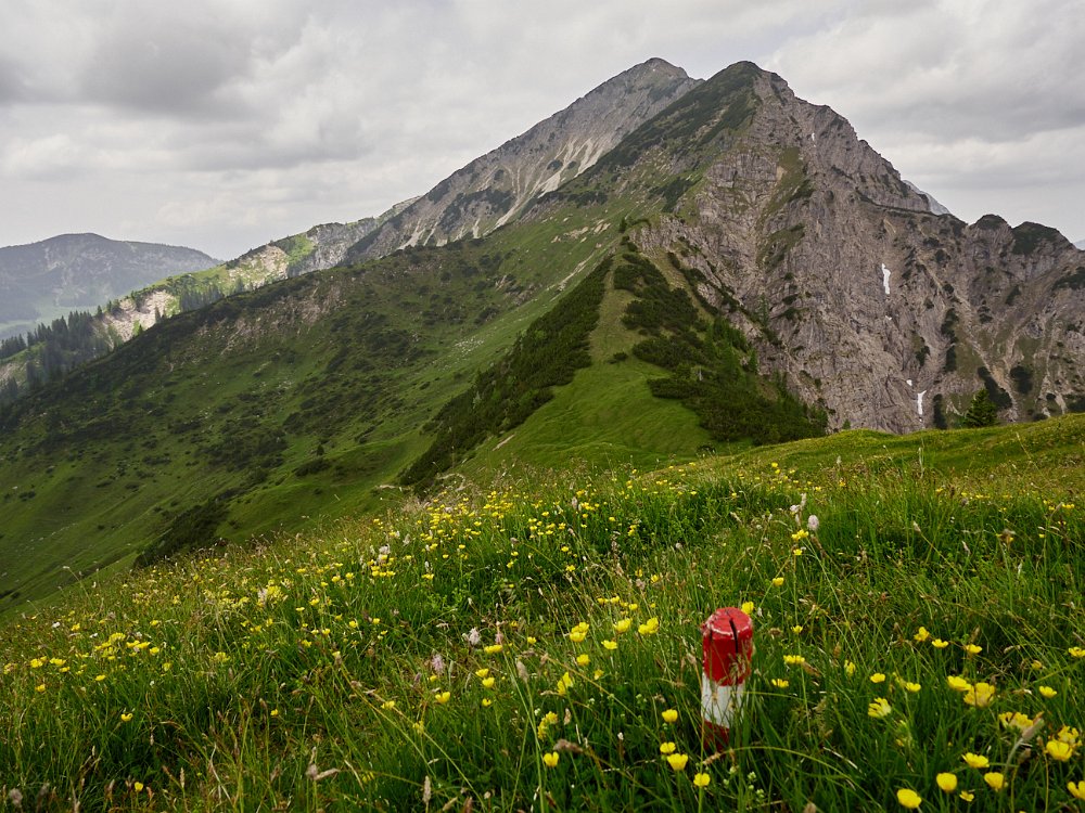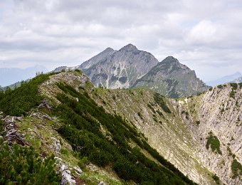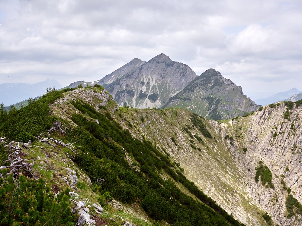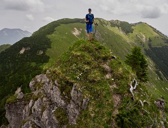 Kernige alpine Abenteuer im Voralpenland? Auf dem Grat vom Wildenkarsattel zum Hinteren Sonnwendjoch gibt es das! Nur für sehr versierte Bergfexen, die Pfade finden und einschätzen können, wo Gefahr droht und wo man durchkommt. Man klettert hier nicht, sondern tastet sich oft auf steilsten, erdigen Graspolstern herum. Einen kitzligen, ausgesetzten Quergang gibt es, wo man mit dem Fuß etwas in die Luft steigen muss auf einen Pflichttritt. Bei Nässe ist die Tour absolut lebensgefährlich und allgemein nur in der genannten Richtung zu empfehlen, weil so die steilsten Passagen im Aufstieg bewältigt werden. Vom Ursprungtal aus kamen 1600Hm zusammen auf unserer Runde.
