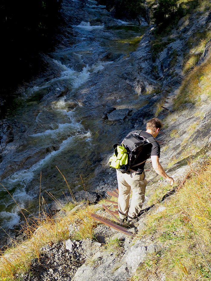 Der Alpengeist tastet sich vorsichtig runter auf den glitschigen Stangen.
