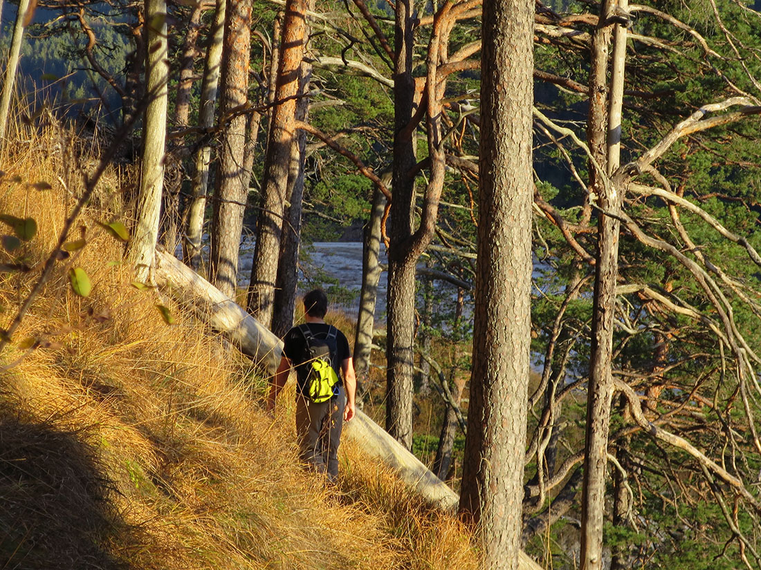 Auf kaum sichtbarem Pfad, der zu meinem Erstaunen 100% korrekt in der Kompasskarte für mein Garmin eingezeichnet ist. Niemand pflegt diesen Weg und so trifft man auf interessante Hindernisse wie diesen arschglatten Baumstamm mitten im Steilhang. | ![]() |