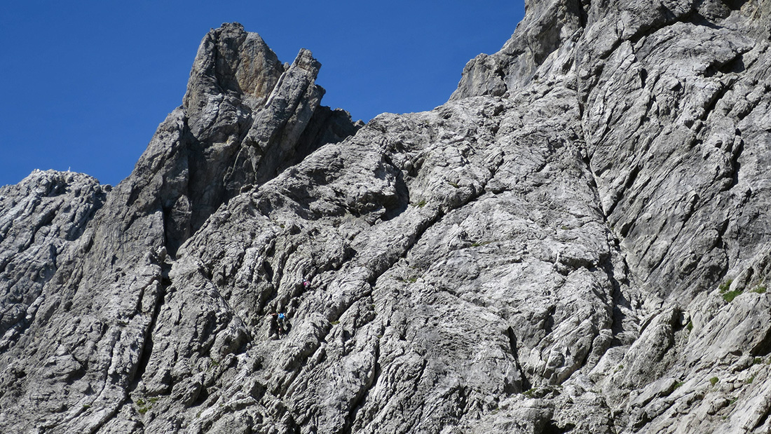 Gegenüber an der Langen Kante ist eine Seilschaft am Schaffen.
