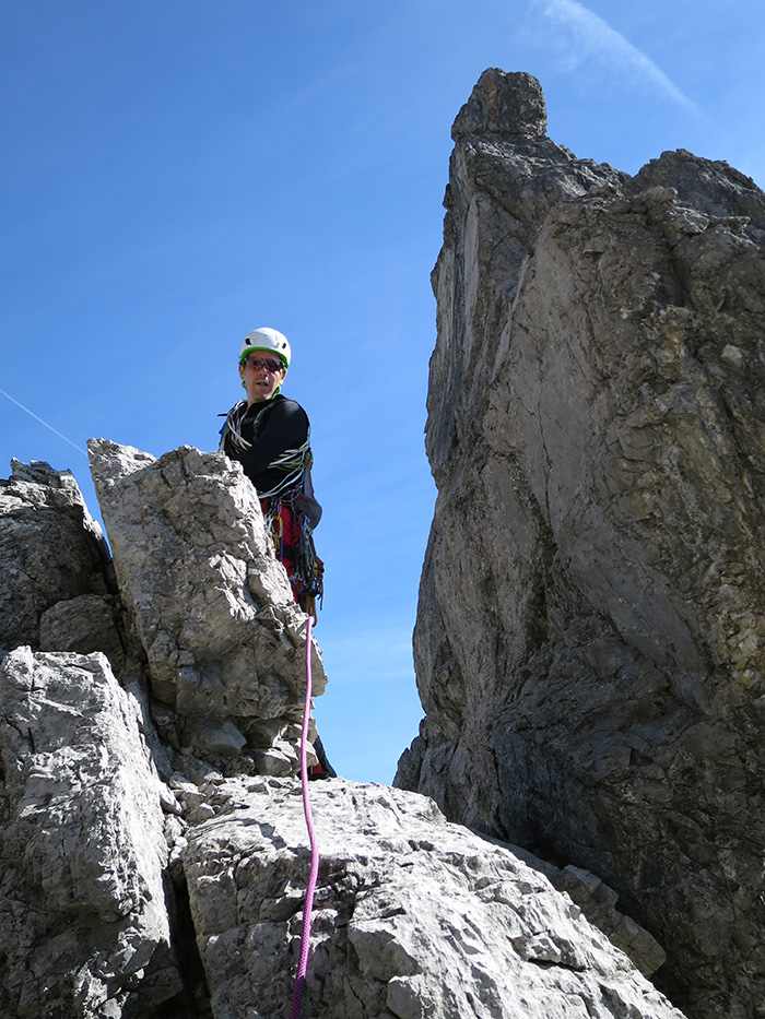 In der SL5, wo man hinter einer Rippe quert und hinter ihr dann in der SL6 in die Wand des Turms einsteigt. Hier muss man dann je nach Verfassung mal kurz durchschnaufen, es geht pfiffig nach unten. | ![]() |
