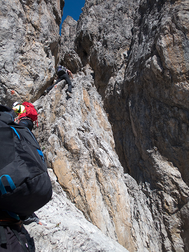 | Mahlzeit. Hier war für den Alpengeist Schluss. Rauf wär noch gegangen, aber dann rückwärts runterrutschen wo es rechts mindestens 15m runterpfeift war einfach zu viel. Ich habe mich zu einem anderen Bergsteiger gesellt, der seine Gruppe ziehen ließ und habe Henning allein weiterrumpeln lassen. Man sieht ihn hier beim Abstieg. | |