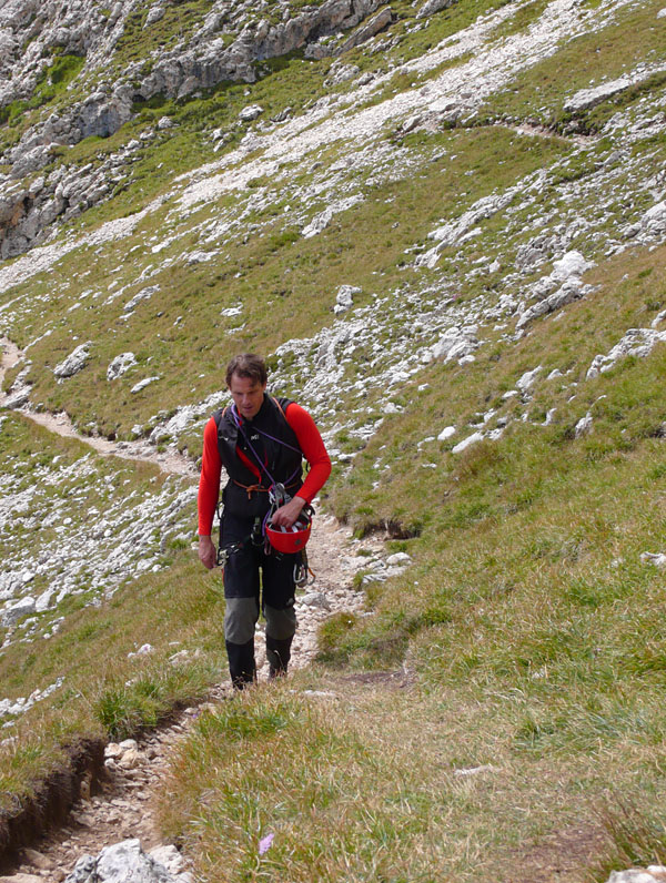 | Der Abstieg führt über den Masaré Klettersteig. Nach 3h Kaminstemmerei ist der Alpengeist ziemlich knülle. Erichs Variante ("so a scheane Linie ka ma doch ned umgehen") folgt oben der schwierigeren Verschneidung (5- bis 5 würd ich schätzen), wogegen die von Bernardi vorgeschlagene Route einen Bogen drum macht. | |