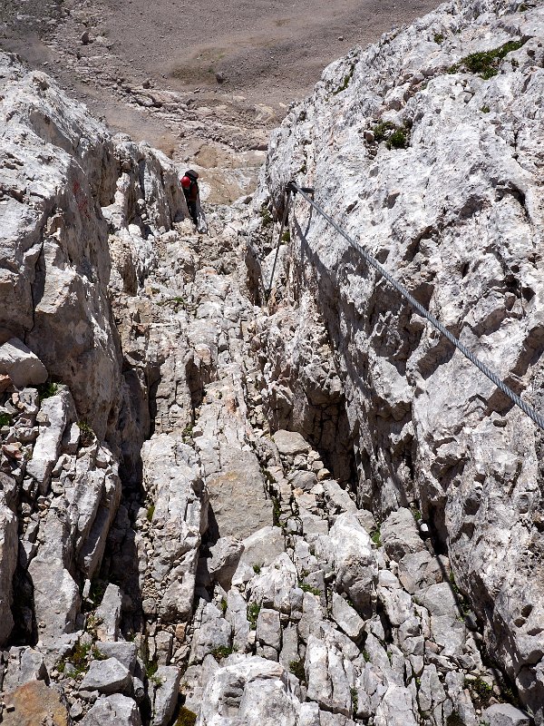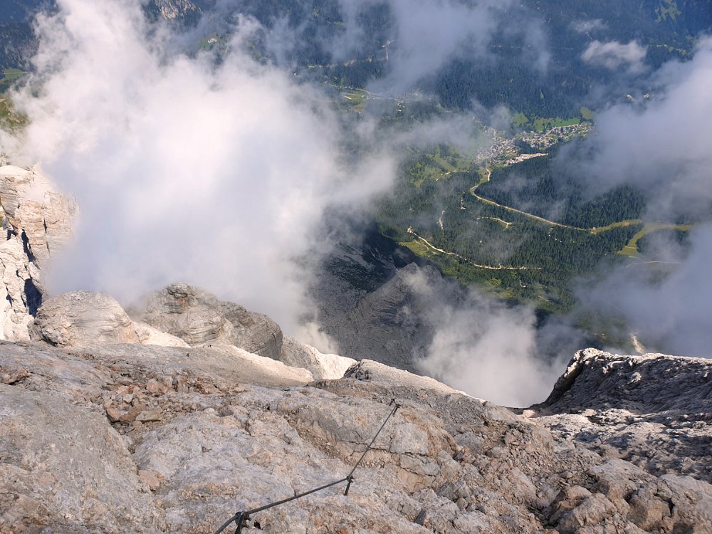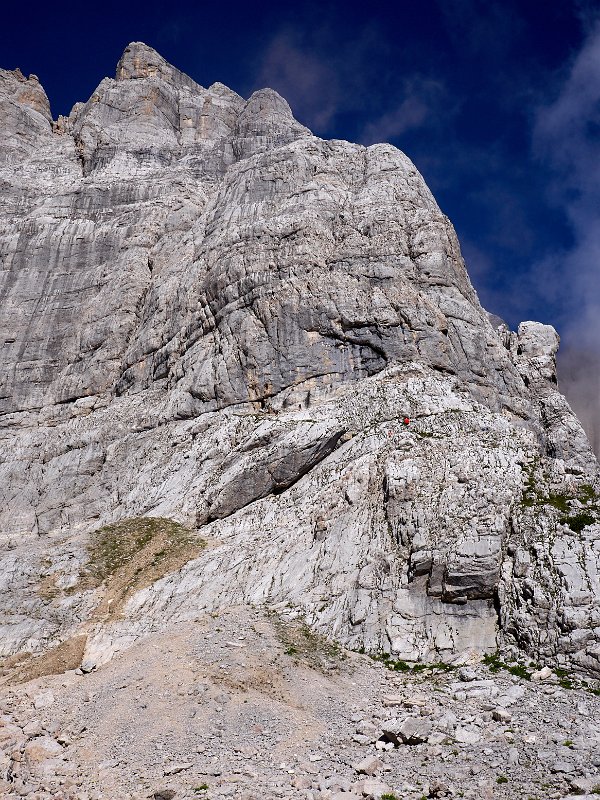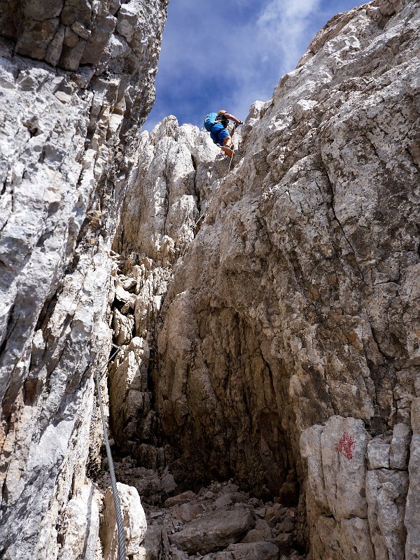 Der Wetterbericht versprach einen schönen Tag in einer sehr unbeständigen Wetterphase. Also ging ich schon am ersten Tag meines Urlaubs gleich die fetteste geplante Tour. Nicht akklimatisiert war das keine gute Idee. Im letzten Drittel bekam ich leichtes Kopfweh. Ich musste die Anstrengung gut dosieren und öfter Pause machen, weil ich sonst in ein Eck gekotzt hätte. Noch nie habe ich so mit mir selber kämpfen müssen. Da waren so einige Aspiranten unterwegs, die auch schwer zu beißen hatten. Der Klettersteig ist eigentlich eine großartige, aber auch sehr lange Unternehmung. Das Ding will und will nicht enden.