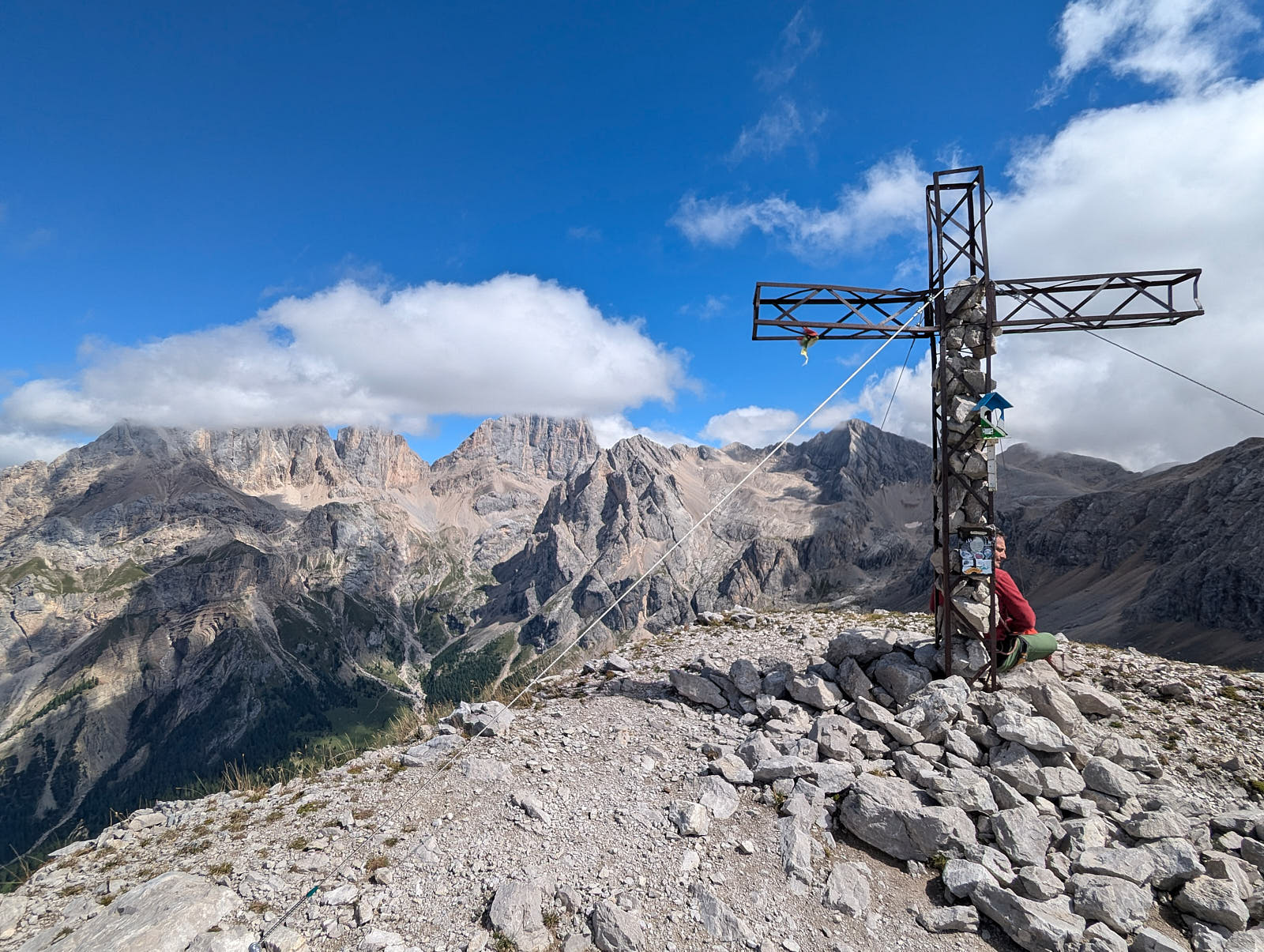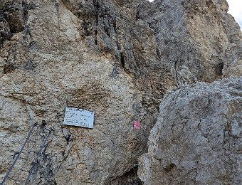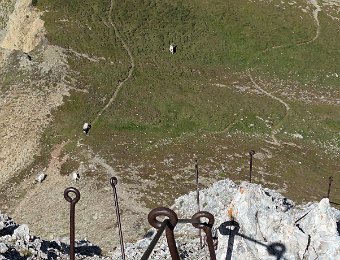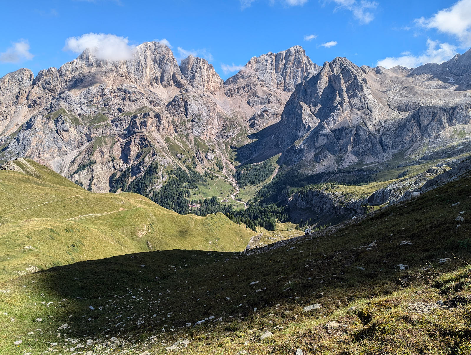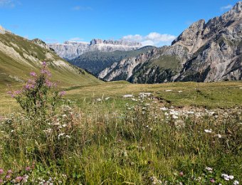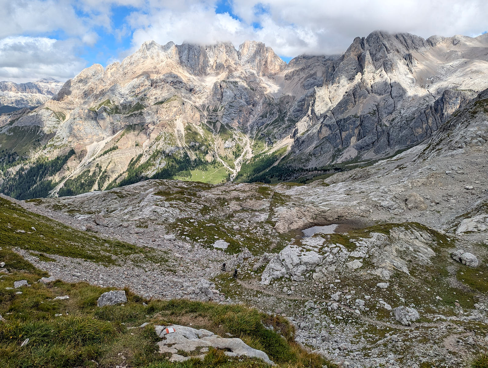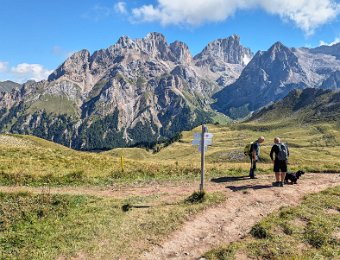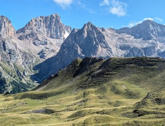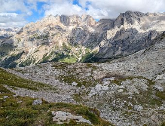 Am Passo San Nicolò zeigt sich die Marmolada Südwand ein Stück weit. Der Aufstieg über den Westgrat auf die Punta Penia ist gut zu sehen.
