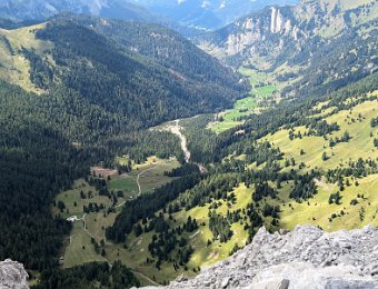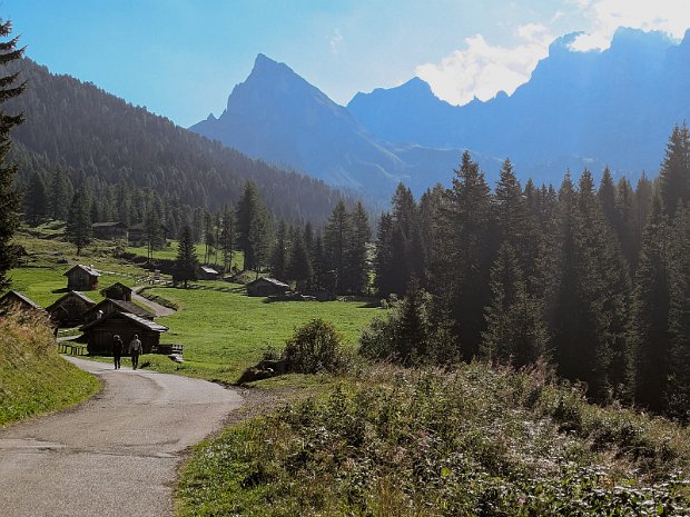 Nach der Fahrt im Shuttlebus folgt gemütliches Wandern im Nikolaustal. Die Pyramide des Col Ombert steht schon da und wartet.
