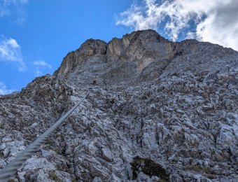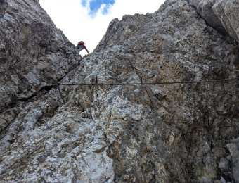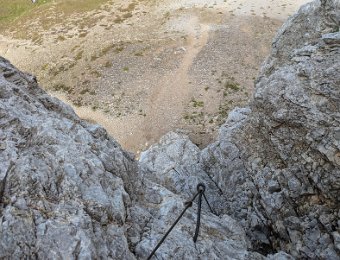 Der Einstieg rechts in den Spalt will es gleich mal wissen. Man kann sich entweder mit Gewalt an dem zu kurzen Seil hoch zerren oder geschickter links davon…
