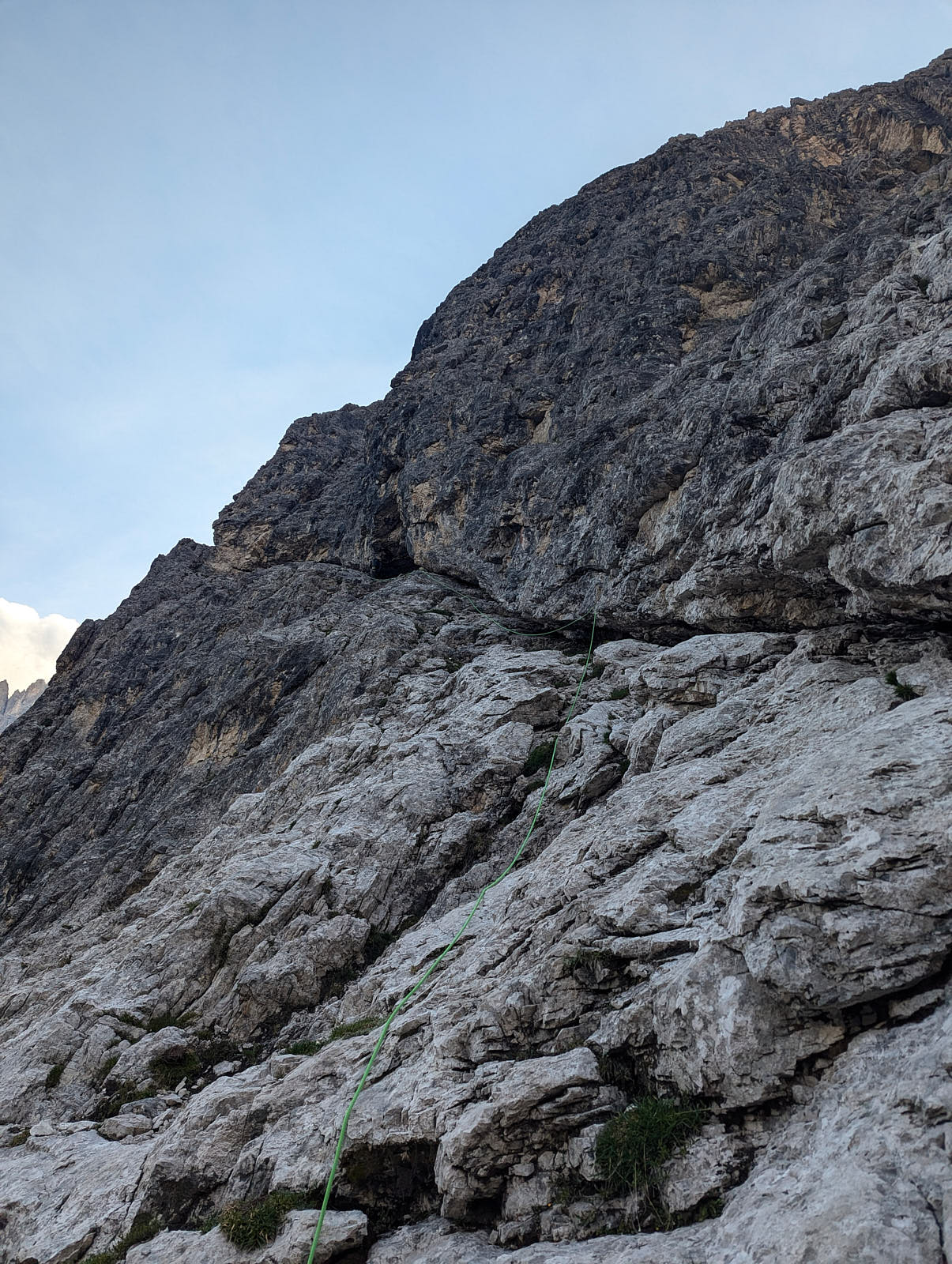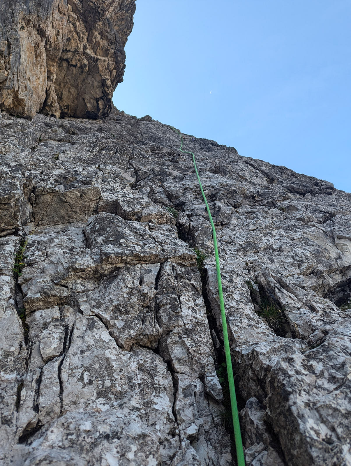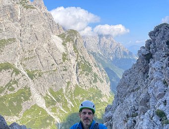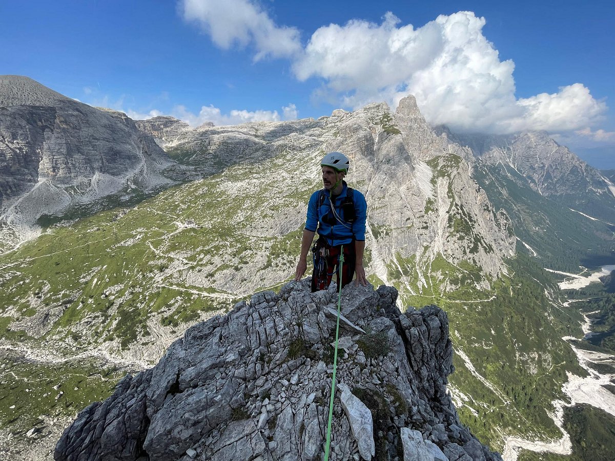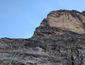 Die Nordkante der Hochleist ist eine Insidertour, für die es im Netz keine Informationen gibt. Der Sextner Bergführer Hannes Egarter kannte natürlich die Route in seinem Wohnzimmer. Die Absicherung ist spärlich. Abgesehen von den insgesamt anständig eingerichteten Ständen gibt's nur an den steilsten Fünfer-Passagen Bohr- und Normalhaken. Sonst gibt's praktisch nichts. Manche Passagen sind auch nicht ganz einfach abzusichern, weil der Fels ziemlich kompakt ist.