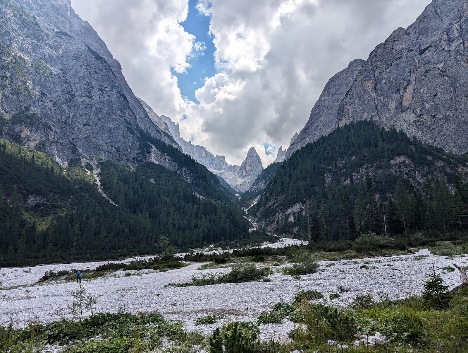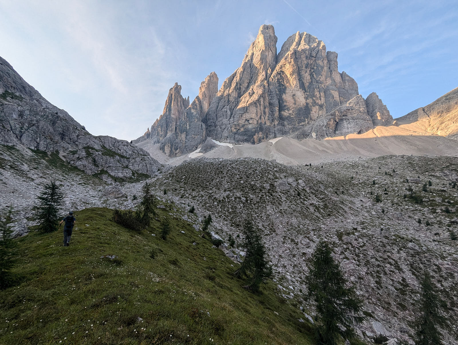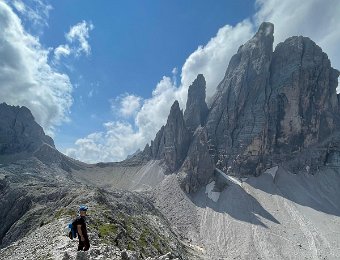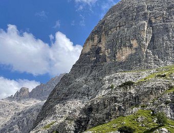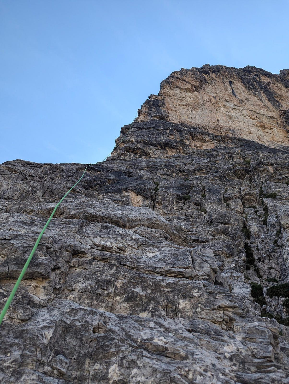 Die Nordkante der Hochleist ist eine Insidertour, für die es im Netz keine Informationen gibt. Der Sextner Bergführer Hannes Egarter kannte natürlich die Route in seinem Wohnzimmer. Die Absicherung ist spärlich. Abgesehen von den insgesamt anständig eingerichteten Ständen gibt's nur an den steilsten Fünfer-Passagen Bohr- und Normalhaken. Sonst gibt's praktisch nichts. Manche Passagen sind auch nicht ganz einfach abzusichern, weil der Fels ziemlich kompakt ist.