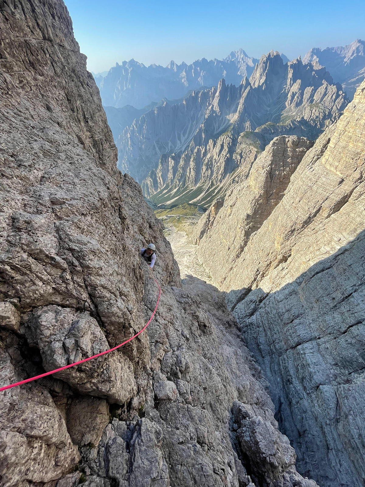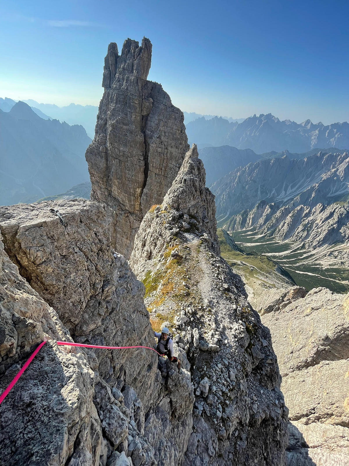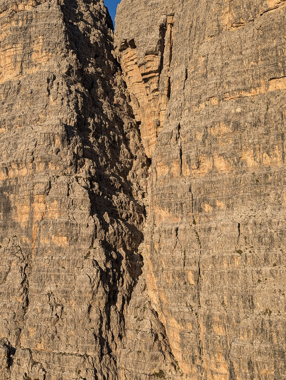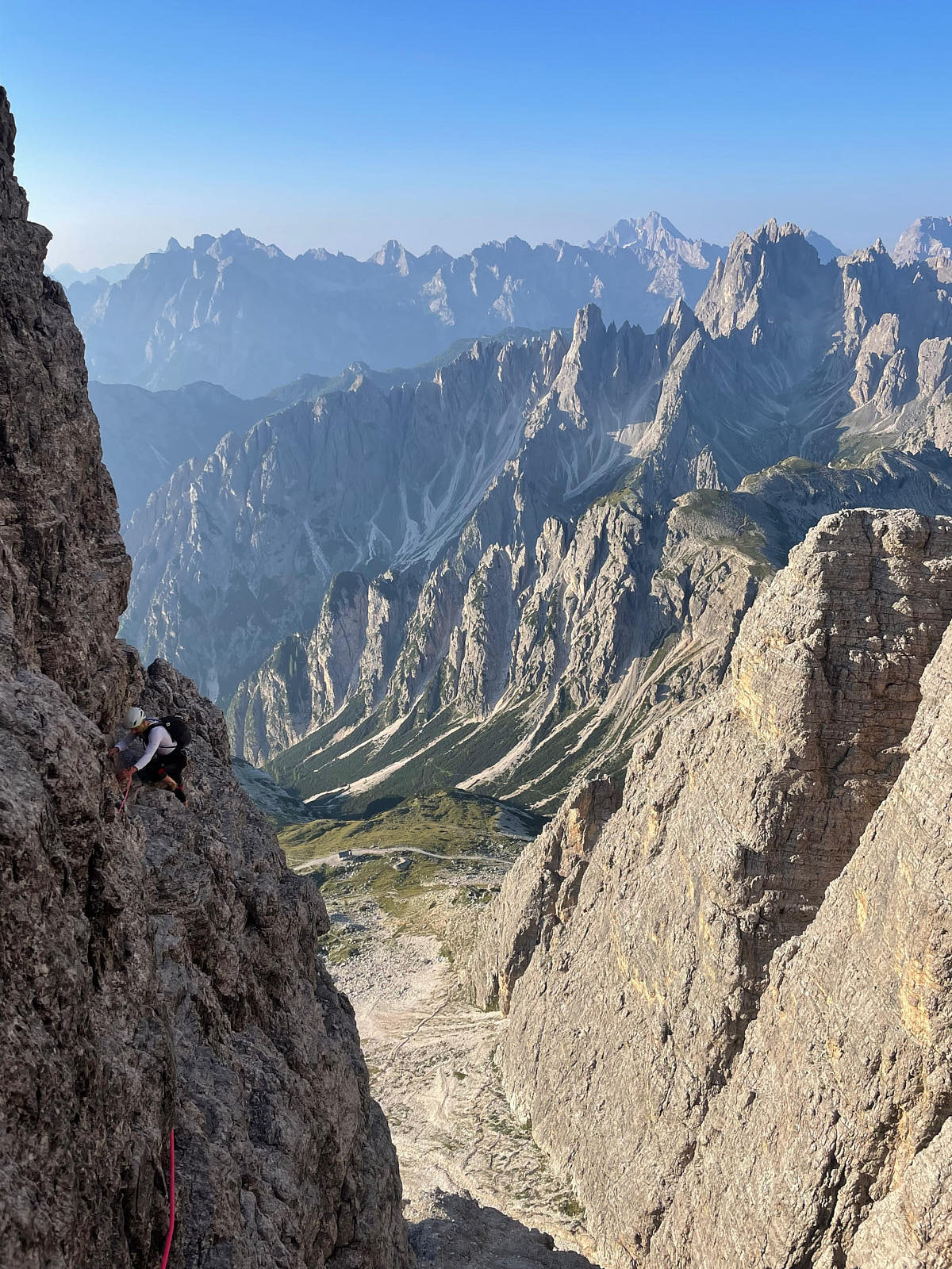 Die zweite Tour mit Hannes sollte ein Klassiker werden. Was gibt's da besseres als eine der Drei Zinnen? Die Kleine Zinne hat den technisch schwierigsten Normalweg und ist weniger überlaufen. Die Route windet sich sehr beeindruckend in einem großartigen Ambiente hinauf auf den Turm. Wenn man einen wieselflinken Vorsteiger hat, der jeden Tritt und Griff auswendig kennt, wird die Kletterei zum Genuss.