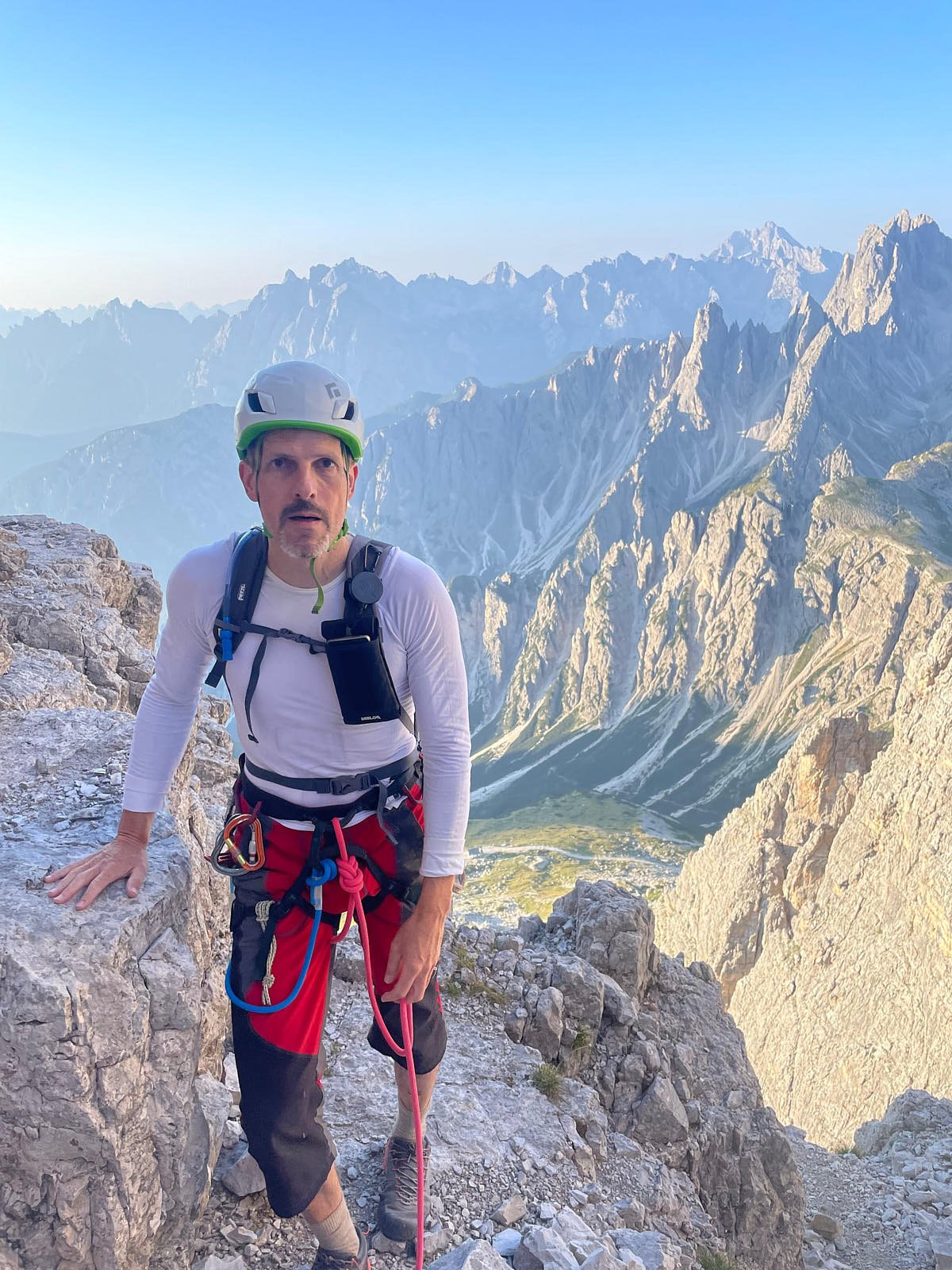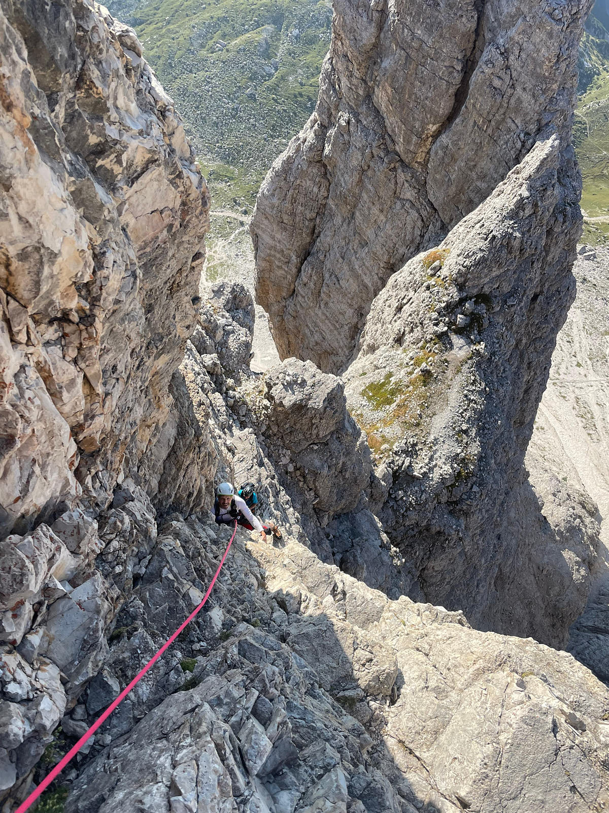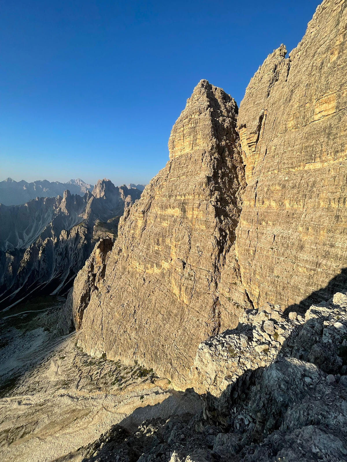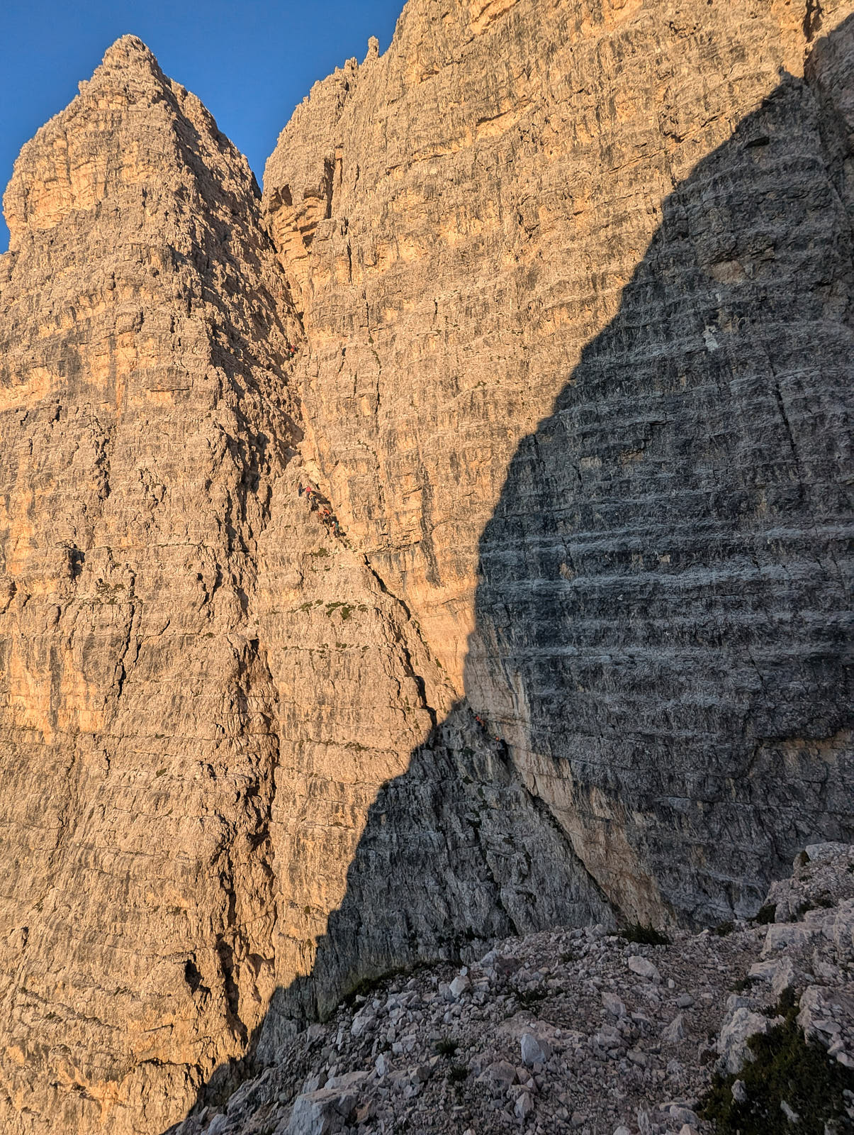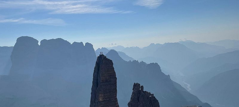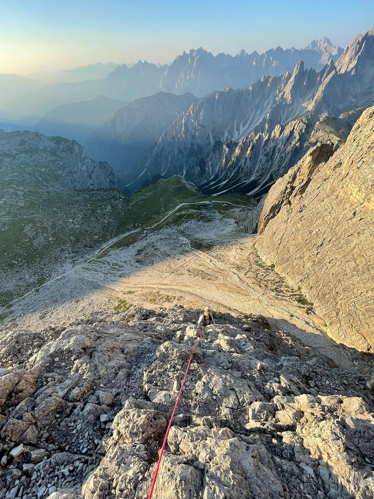 Die zweite Tour mit Hannes sollte ein Klassiker werden. Was gibt's da besseres als eine der Drei Zinnen? Die Kleine Zinne hat den technisch schwierigsten Normalweg und ist weniger überlaufen. Die Route windet sich sehr beeindruckend in einem großartigen Ambiente hinauf auf den Turm. Wenn man einen wieselflinken Vorsteiger hat, der jeden Tritt und Griff auswendig kennt, wird die Kletterei zum Genuss.
