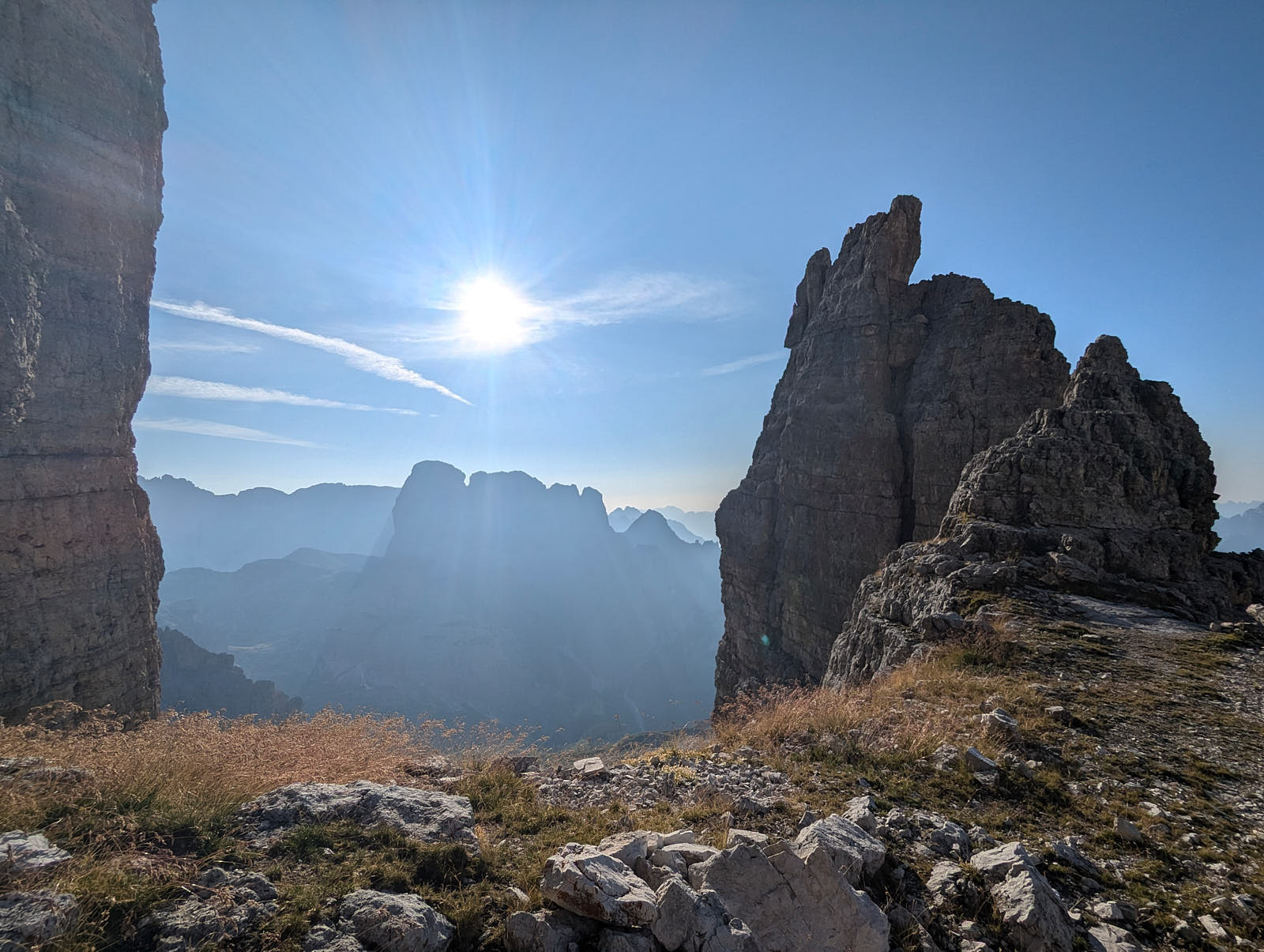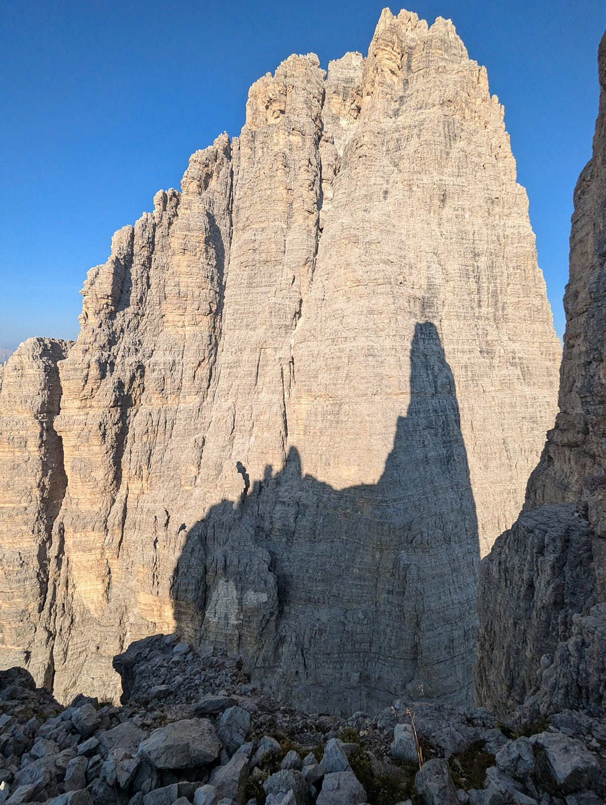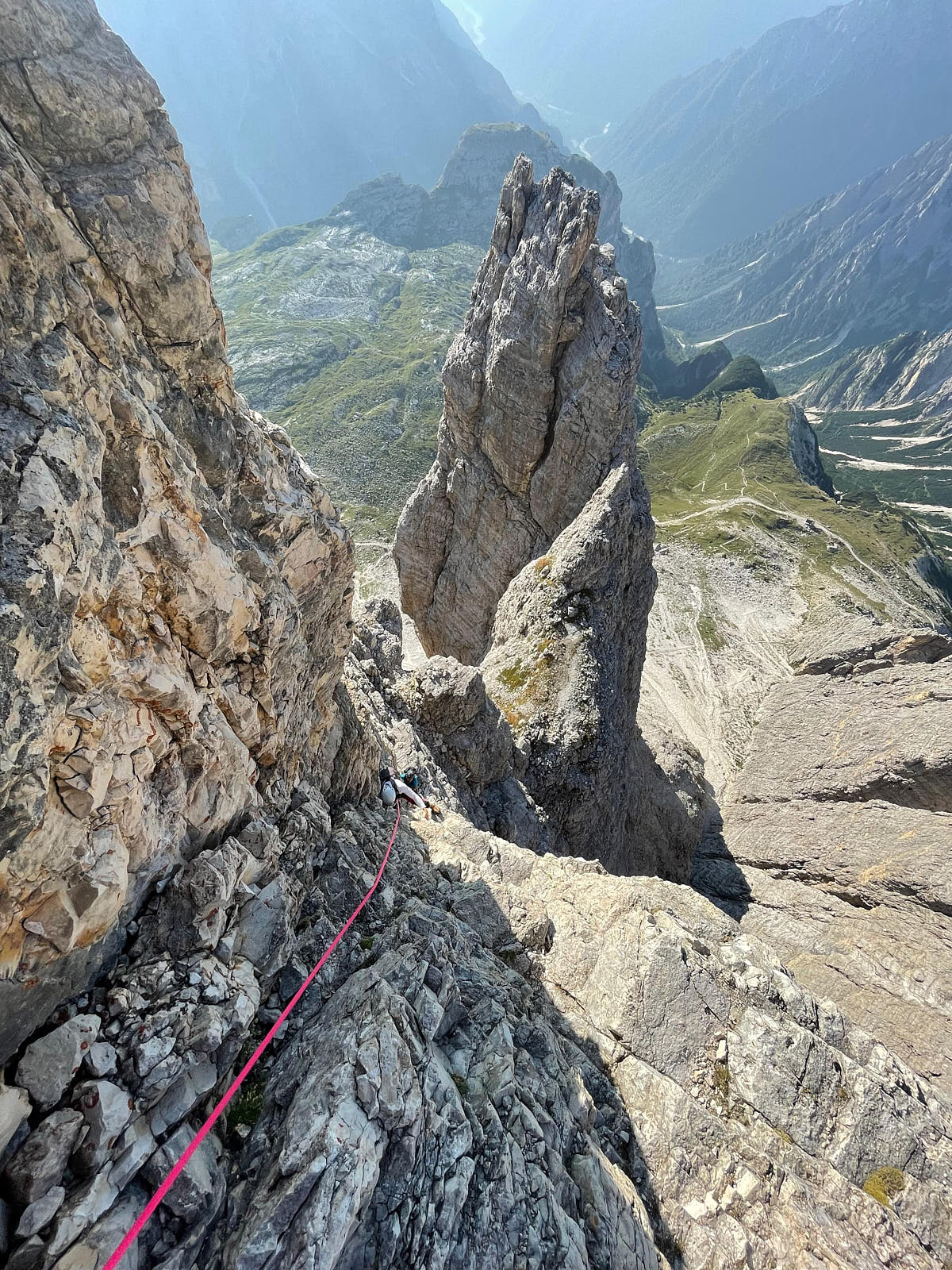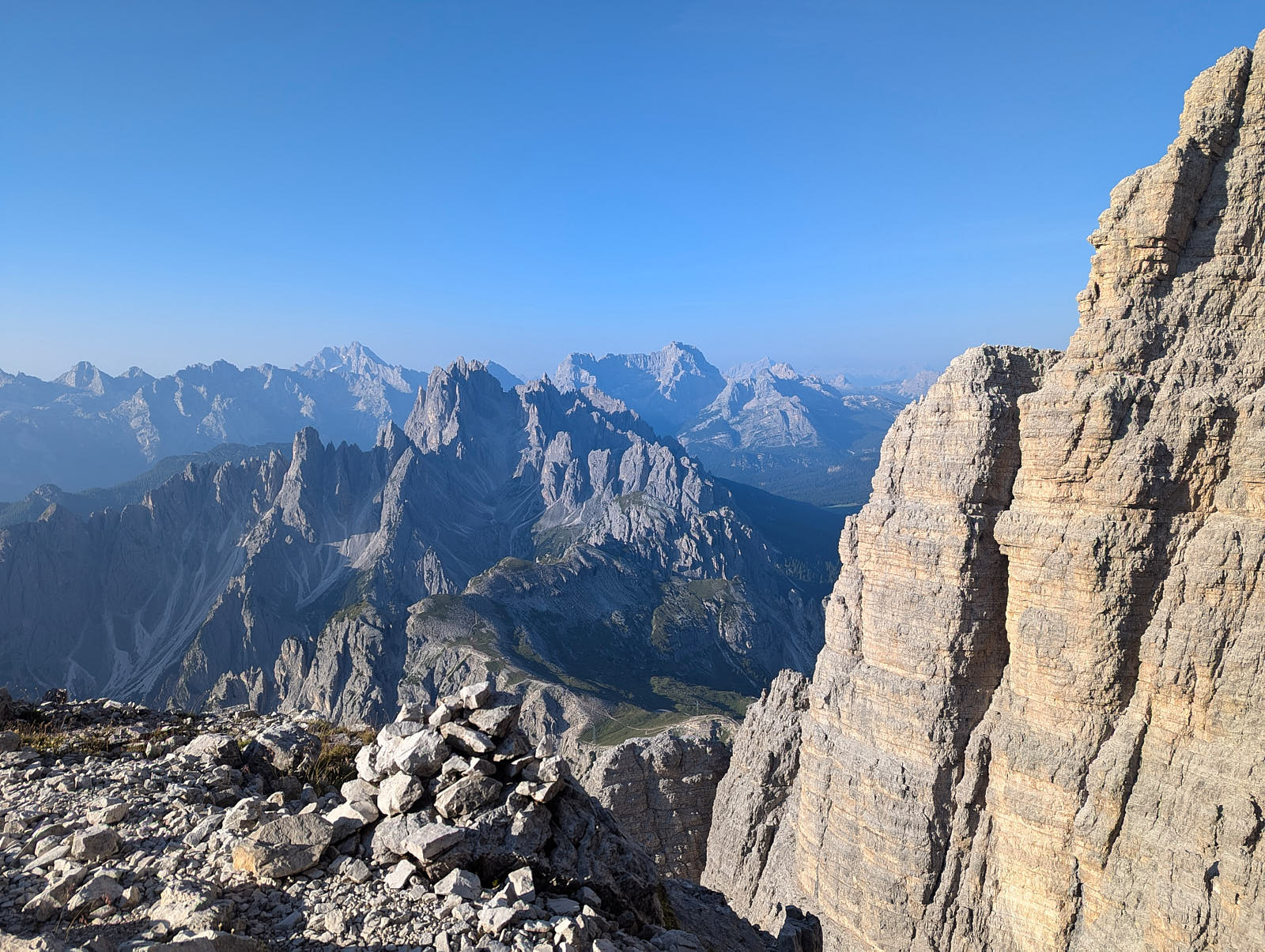 Die zweite Tour mit Hannes sollte ein Klassiker werden. Was gibt's da besseres als eine der Drei Zinnen? Die Kleine Zinne hat den technisch schwierigsten Normalweg und ist weniger überlaufen. Die Route windet sich sehr beeindruckend in einem großartigen Ambiente hinauf auf den Turm. Wenn man einen wieselflinken Vorsteiger hat, der jeden Tritt und Griff auswendig kennt, wird die Kletterei zum Genuss.