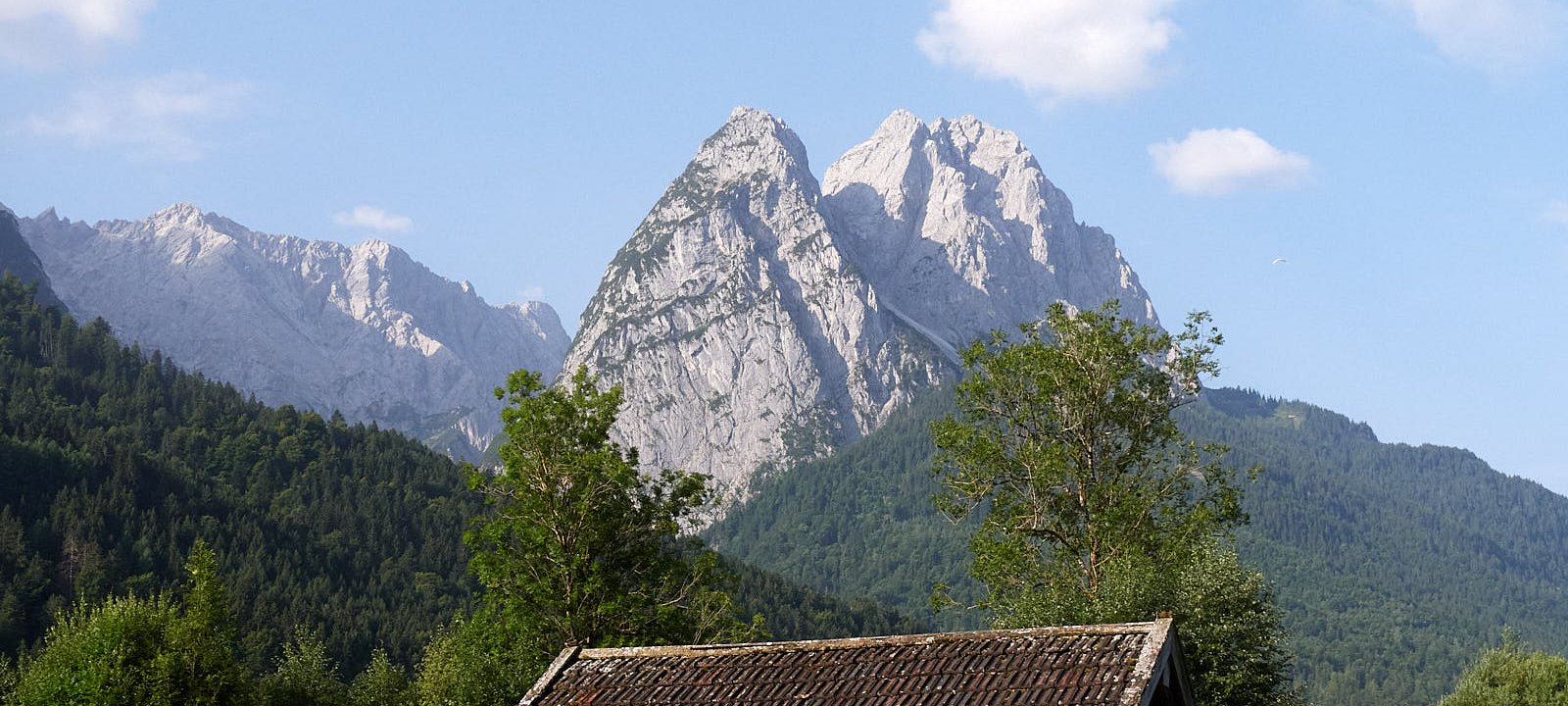 Da stehen sie. Links der kleine Waxenstein mit dem eingebettenen Manndl-Gipfl (wo der Schatten in der Wand oben endet) . Rechts der Zwölfer.