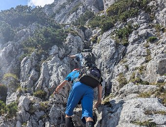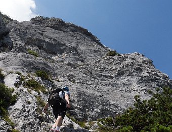 Rein ins Vergnügen. Man muss eine Rinne hochsteigen und dann oberhalb des Latschengürtel rechts aufsteigend zum Grat queren. Es hängen ausgeblichene rosa…