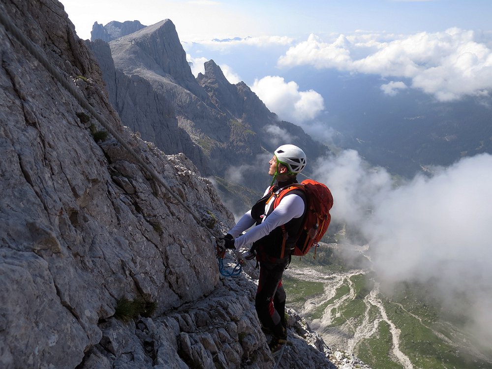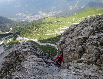 Es folgen immer wieder herrlich griffige Platten. Noch ist die Aussicht eingermaßen gut. Hinten ist die Cima Rosetta mit der Seilbahn zu sehen. Dort wollen wir…