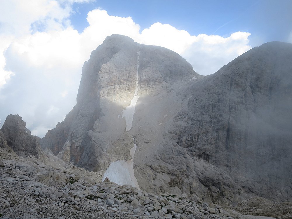 So, nächste Aufgabe: die Vezzana. Das ist nur der Vorgipfel, der eigentliche Gipfel ist noch ein Eck weiter hinten. Das steile Schotterfeld wirkt nicht…