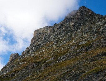Weiter links in der Flanke erkennt man schon die Schwachstelle, eine markante Rinne. Dort hat der Weg einige Ketten und kann ohne weiteres in die Schwierigkeit…