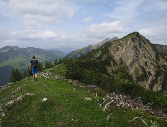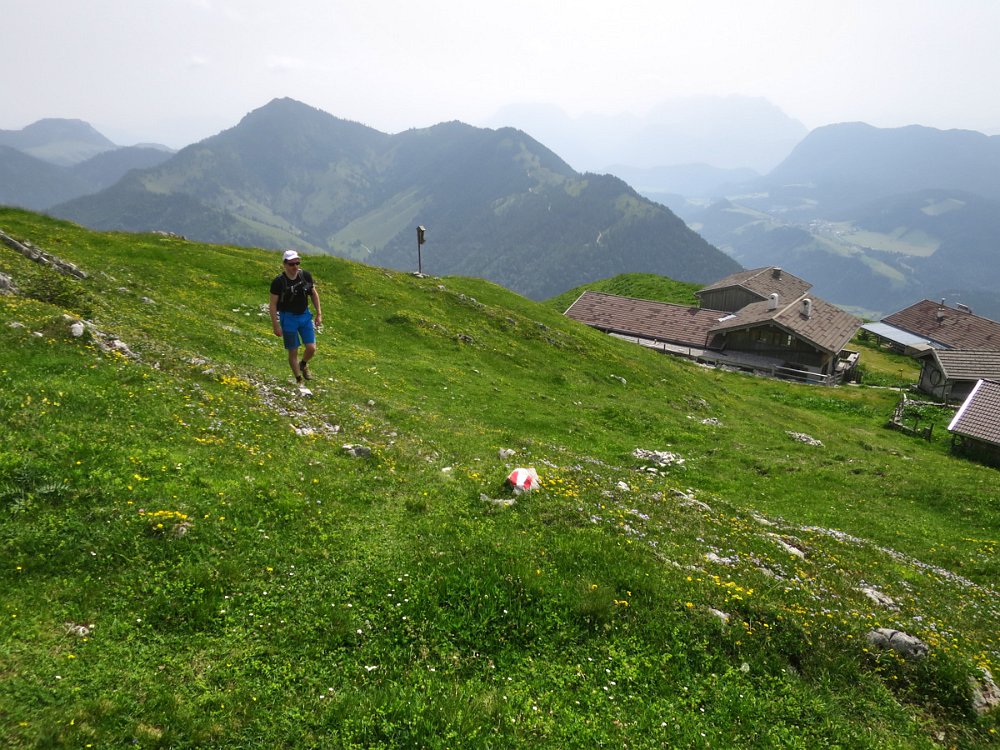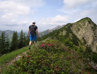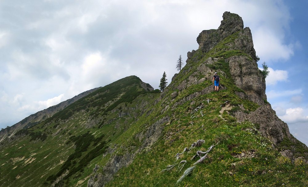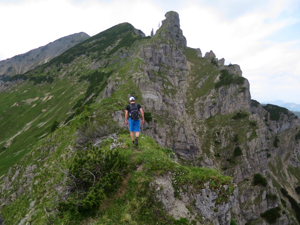 Kernige alpine Abenteuer im Voralpenland? Auf dem Grat vom Wildenkarsattel zum Hinteren Sonnwendjoch gibt es das! Nur für sehr versierte Bergfexen, die Pfade finden und einschätzen können, wo Gefahr droht und wo man durchkommt. Man klettert hier nicht, sondern tastet sich oft auf steilsten, erdigen Graspolstern herum. Einen kitzligen, ausgesetzten Quergang gibt es, wo man mit dem Fuß etwas in die Luft steigen muss auf einen Pflichttritt. Bei Nässe ist die Tour absolut lebensgefährlich und allgemein nur in der genannten Richtung zu empfehlen, weil so die steilsten Passagen im Aufstieg bewältigt werden. Vom Ursprungtal aus kamen 1600Hm zusammen auf unserer Runde.